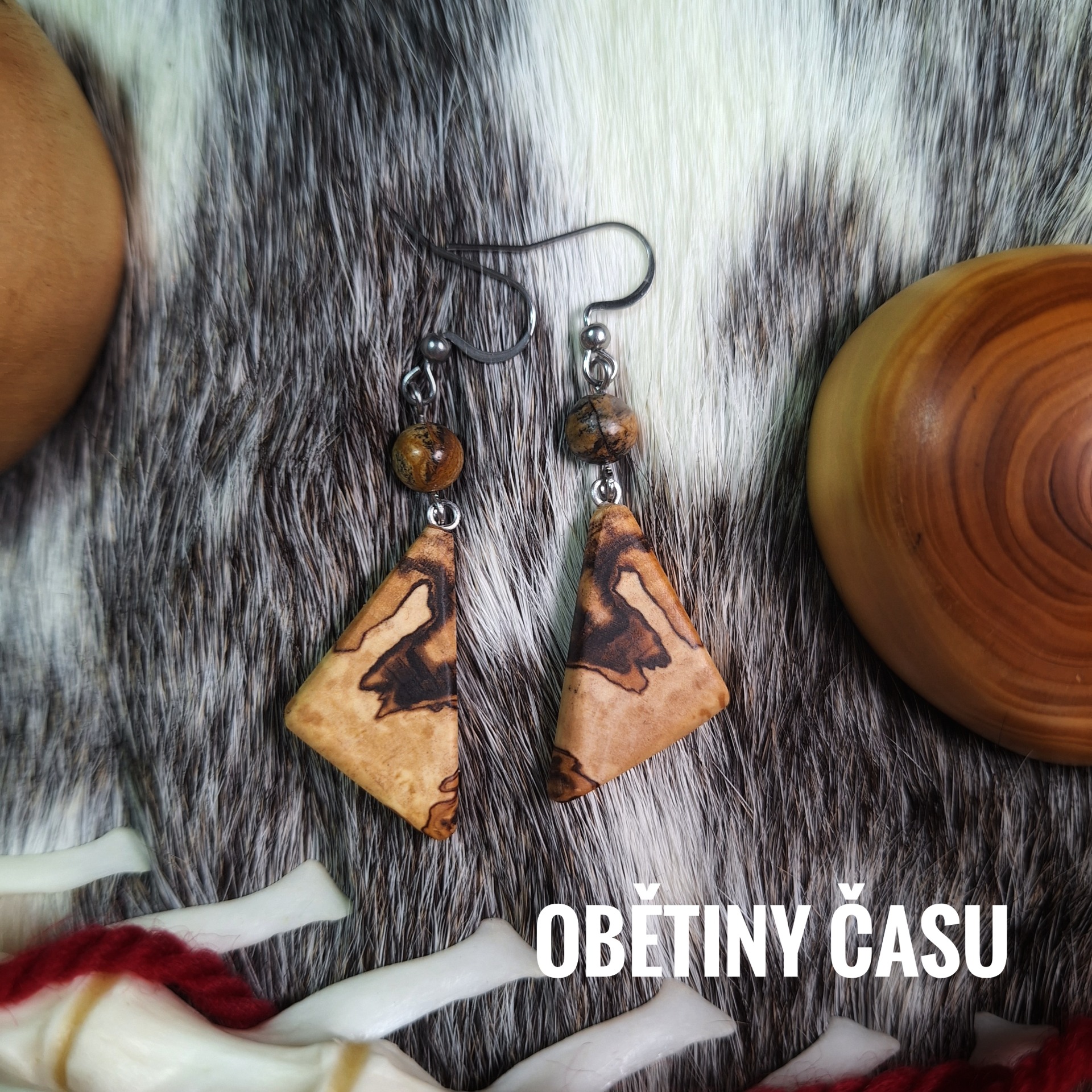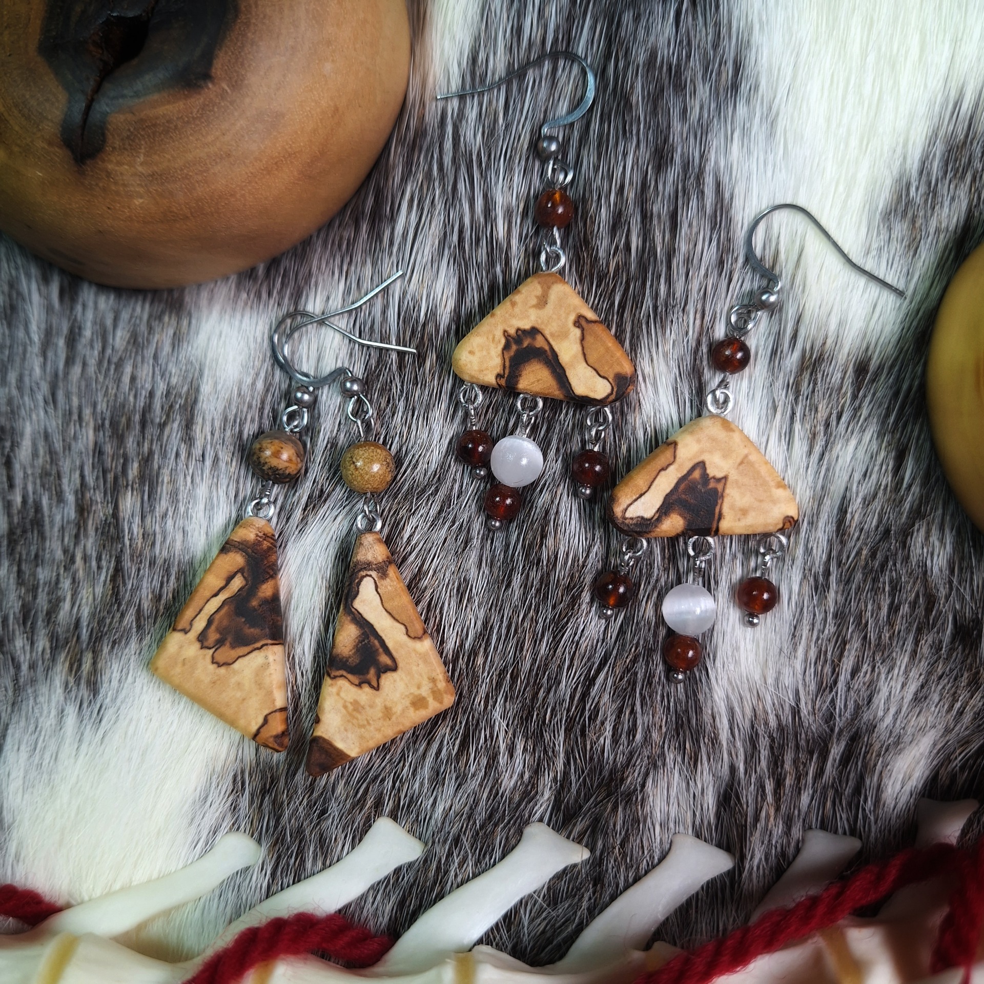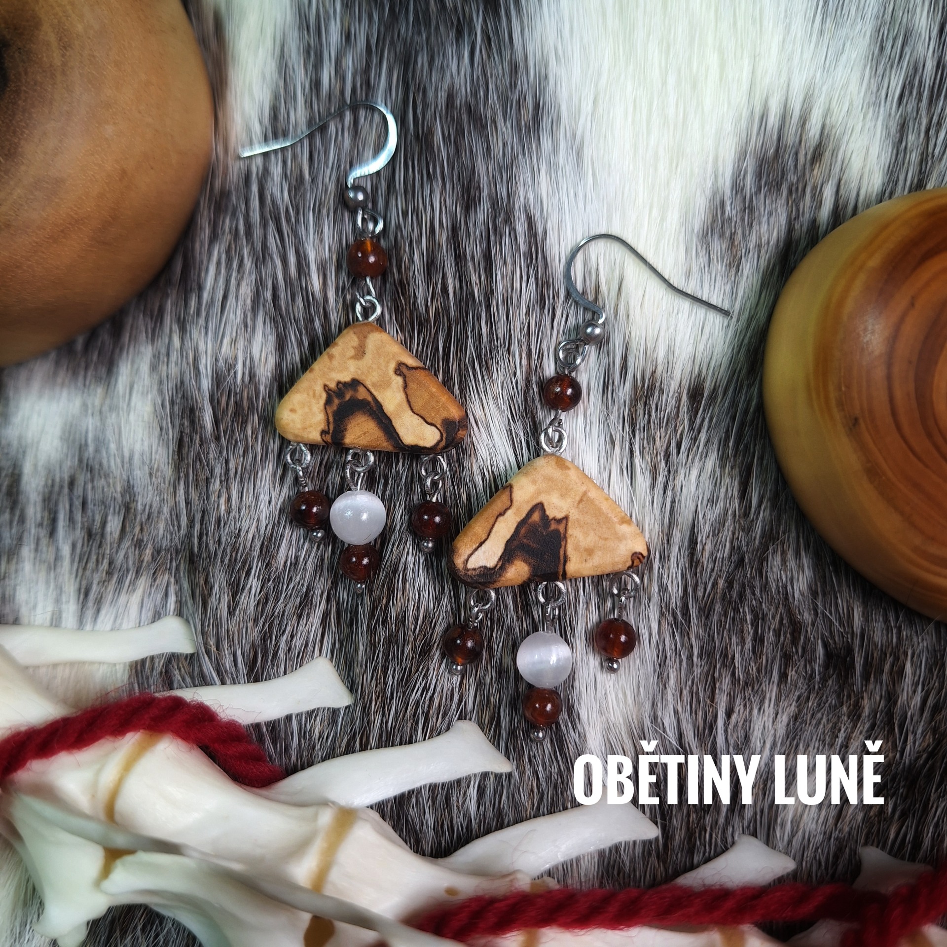 Náušnice ze dřeva spaltované břízy se selenitem a granáty (Obětiny Luně) či zkamenělým dřevem (Obětiny času)
