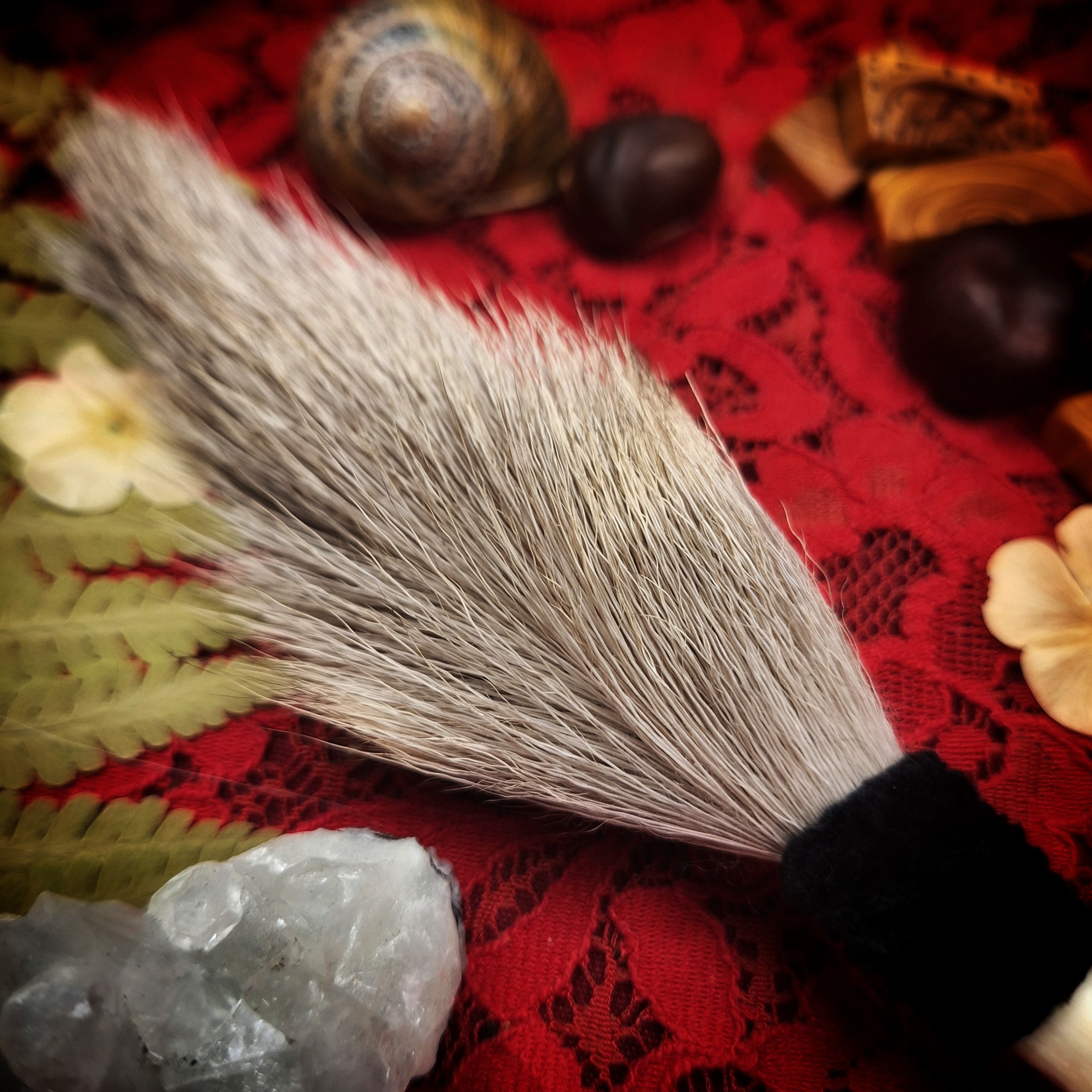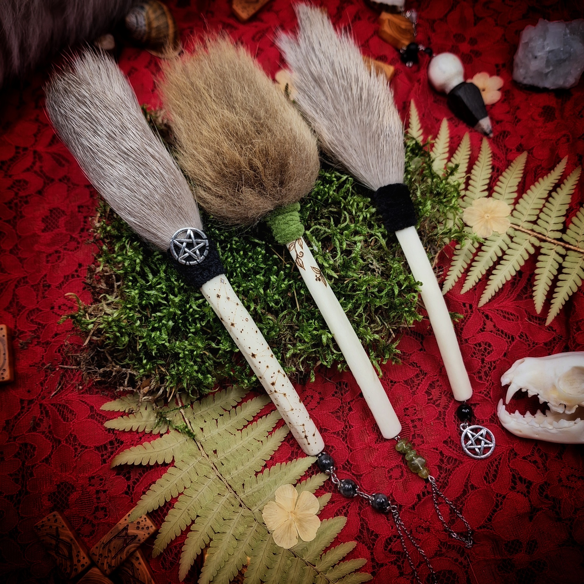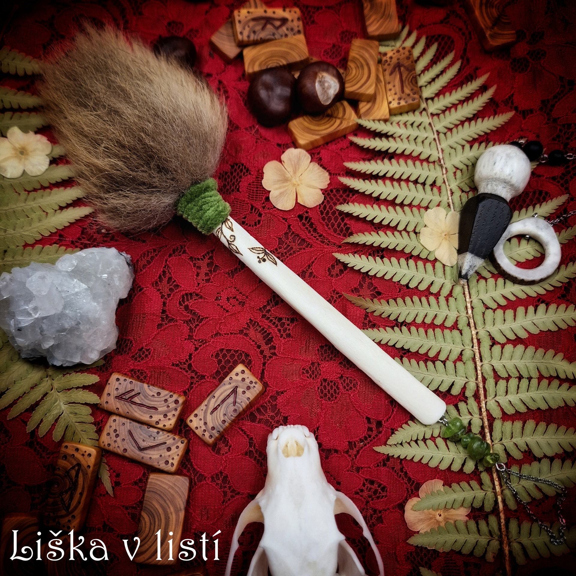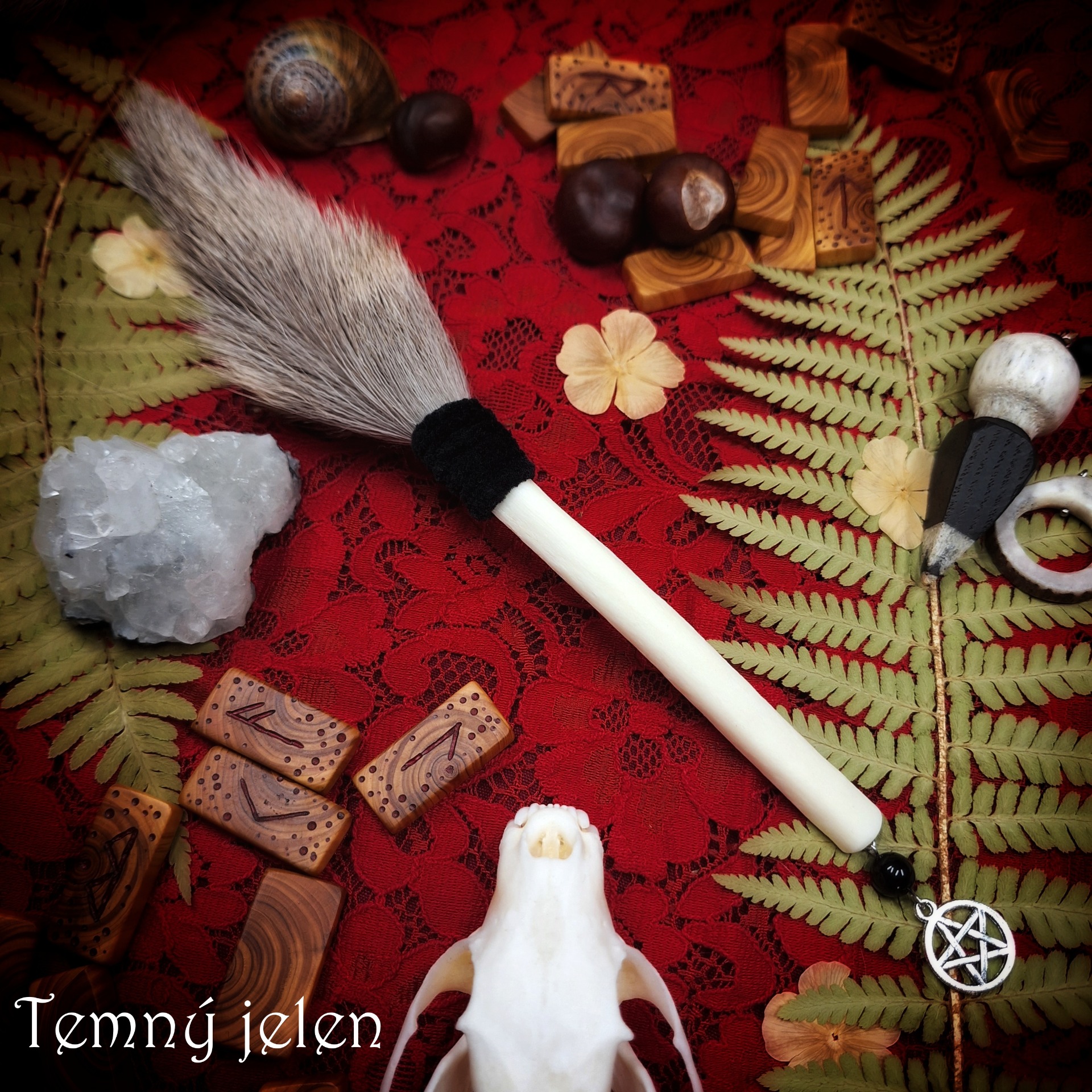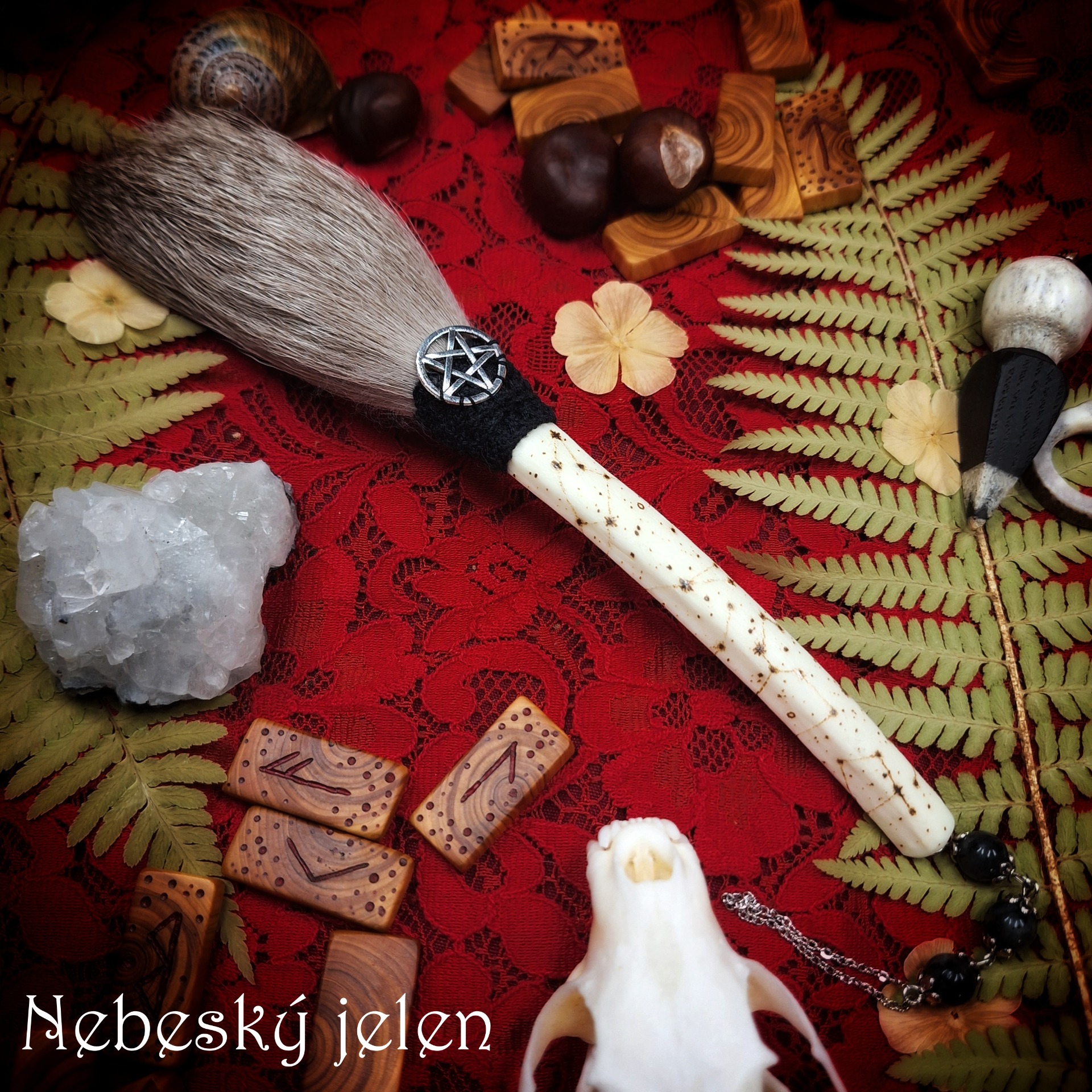 Čarodějnická košťátka z jeleních žeber a kožešiny k očistě a ochraně prostoru.