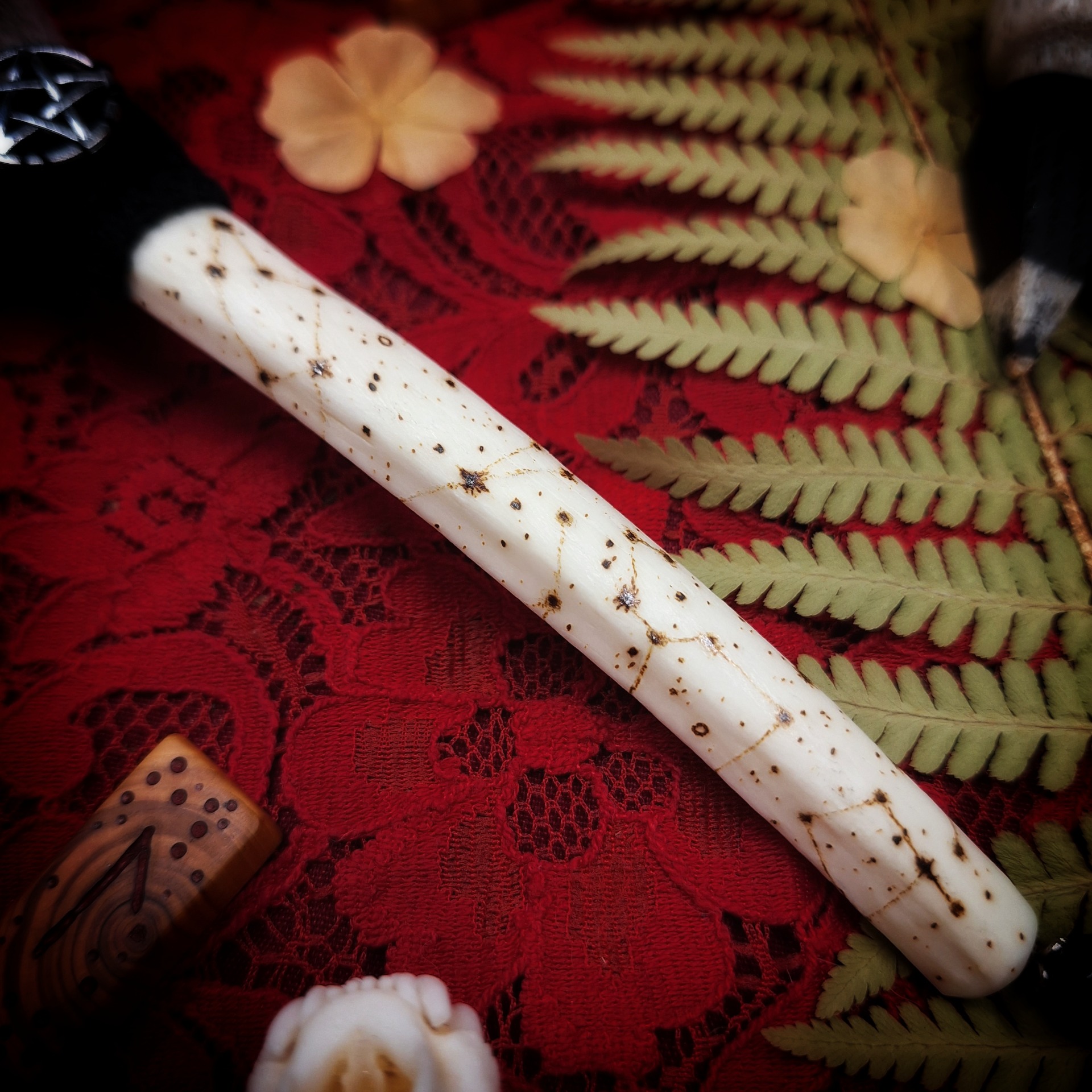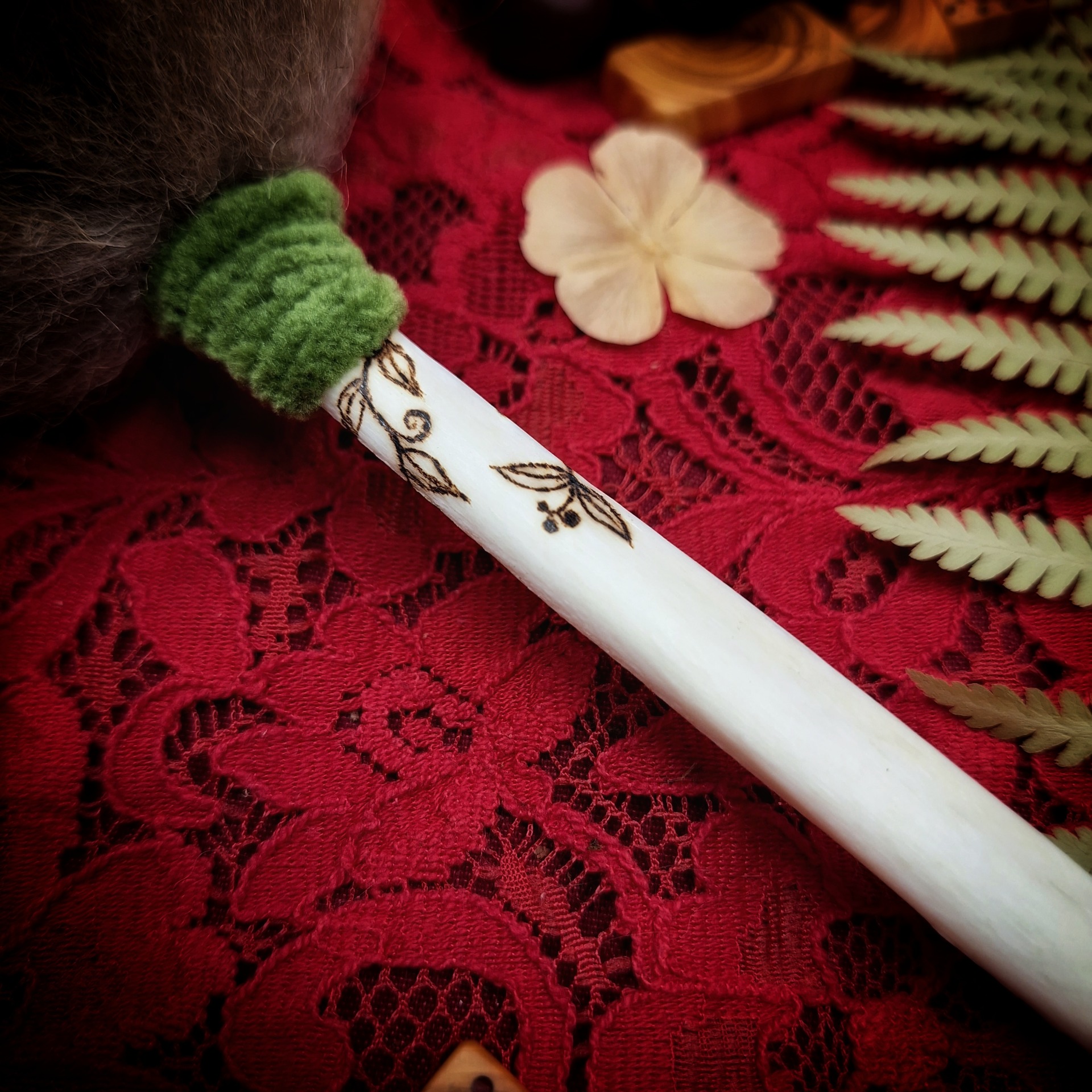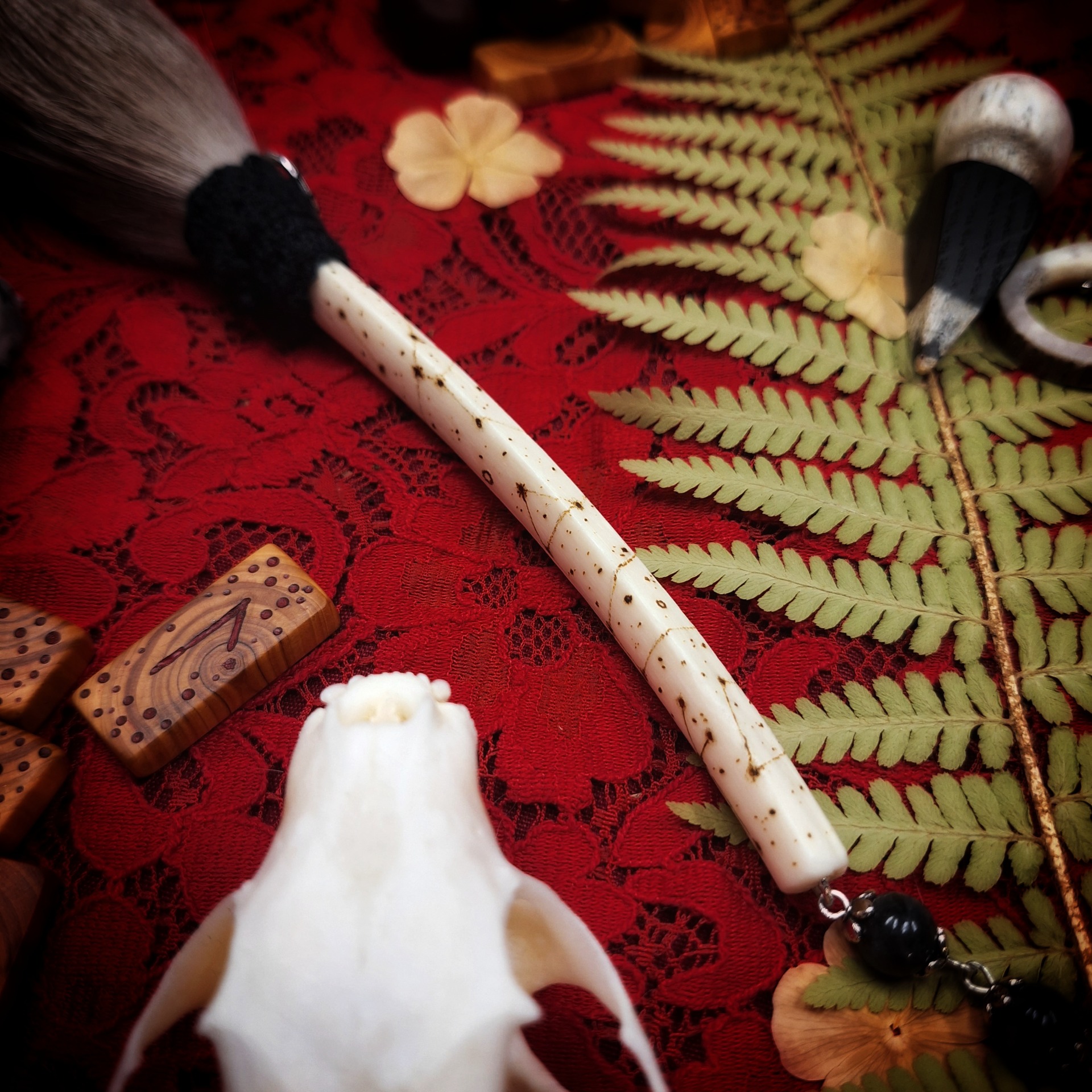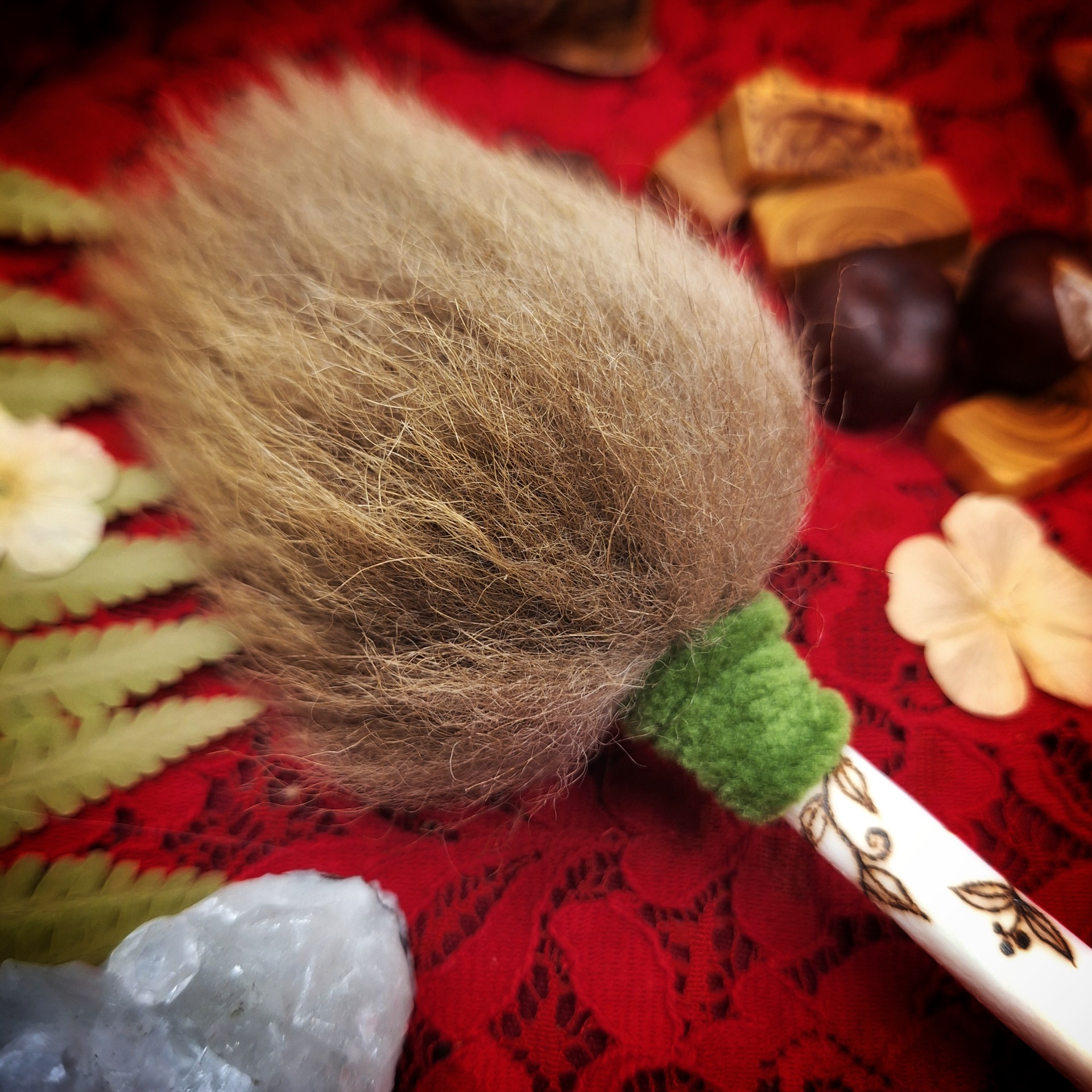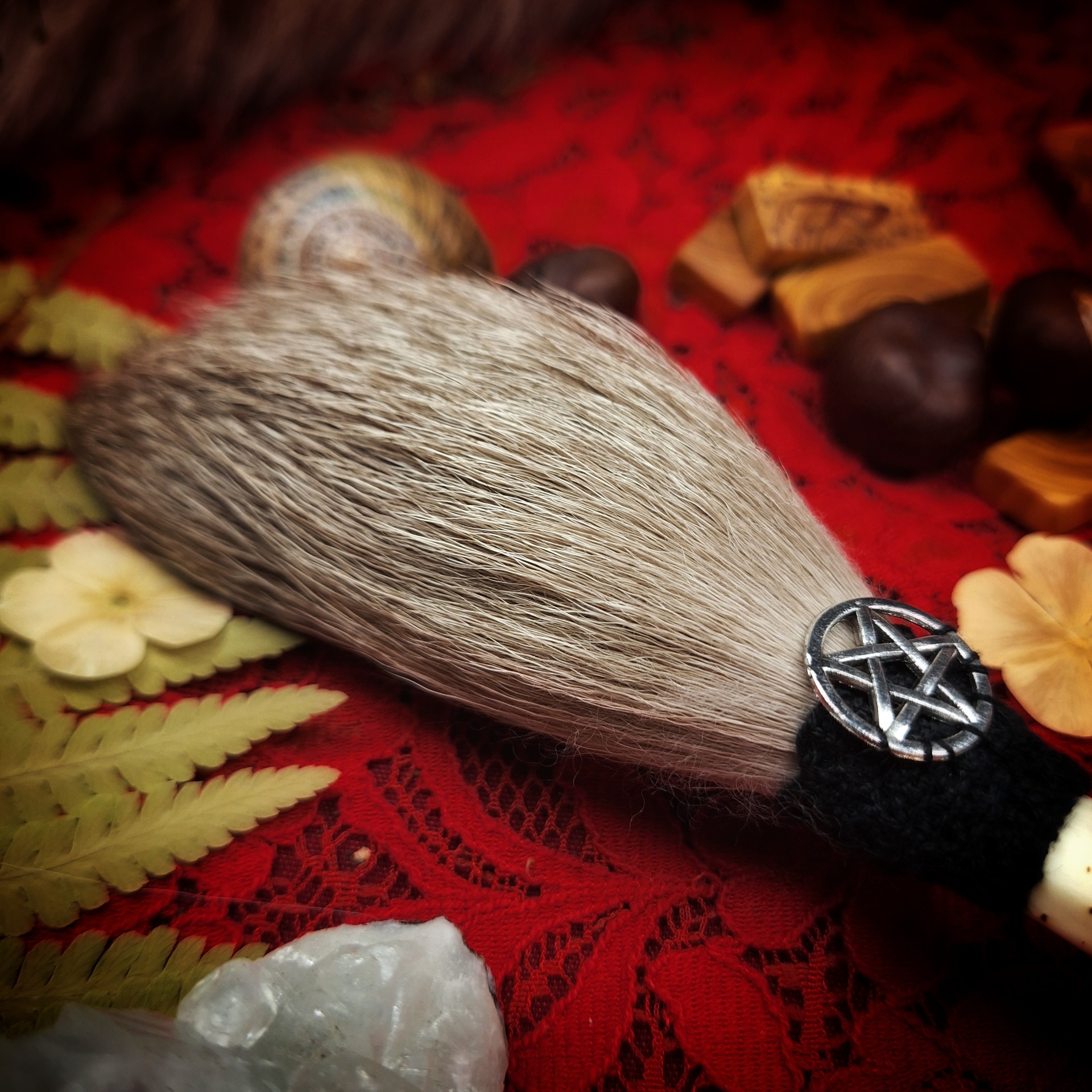 Čarodějnická košťátka z jeleních žeber a kožešiny k očistě a ochraně prostoru.