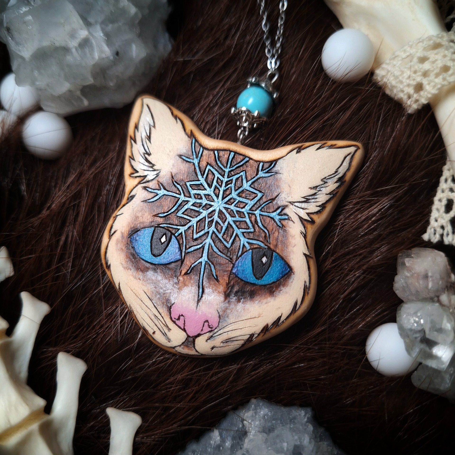 Micina je ručně vyřezána ze dřeva bílého topolu, vypálena a domalována akrylovou barvou, ošetřena je přírodně domácím Runomazem. Doplňuje ji řetízkové očko s tyrkenitem.