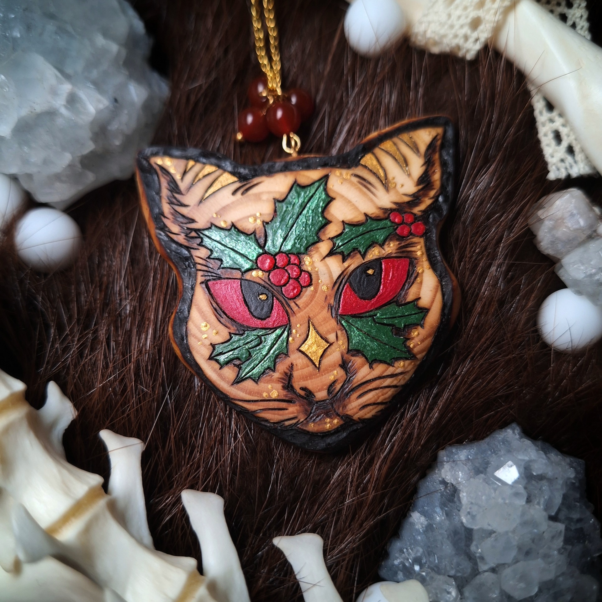 Micina je ručně vyřezána ze dřeva borovice, vypálena a domalována akrylovou barvou, ošetřena je přírodně domácím Runomazem. Doplňuje ji řetízkové očko s karneoly.