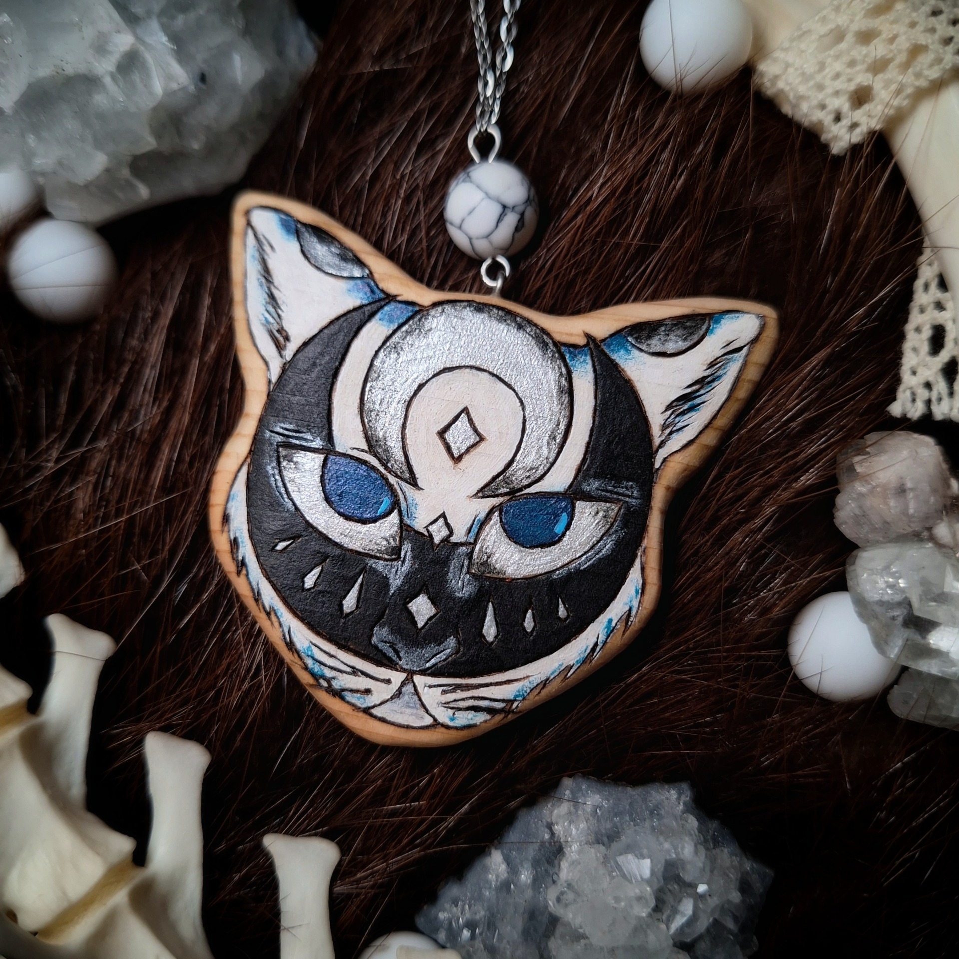Micina je ručně vyřezána ze dřeva středomořského cypřiše, vypálena a domalována akrylovou barvou, ošetřena je přírodně domácím Runomazem. Doplňuje ji řetízkové očko s magnezitem.
