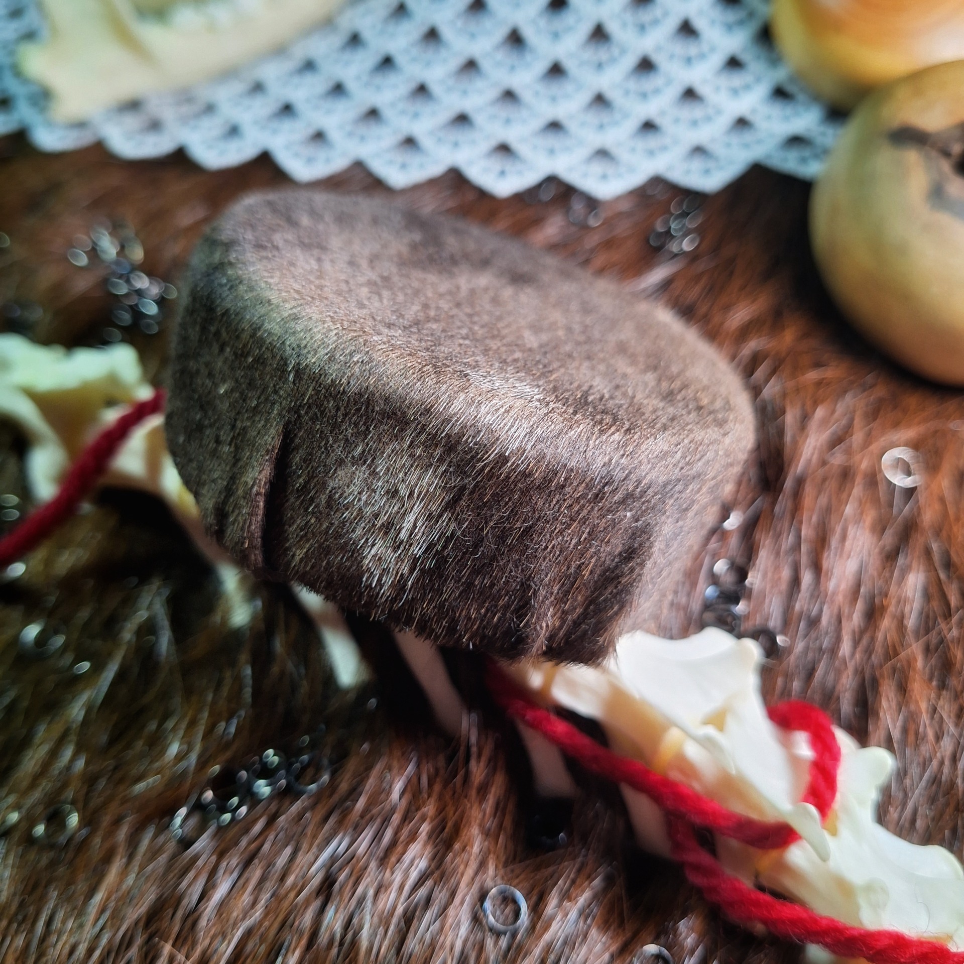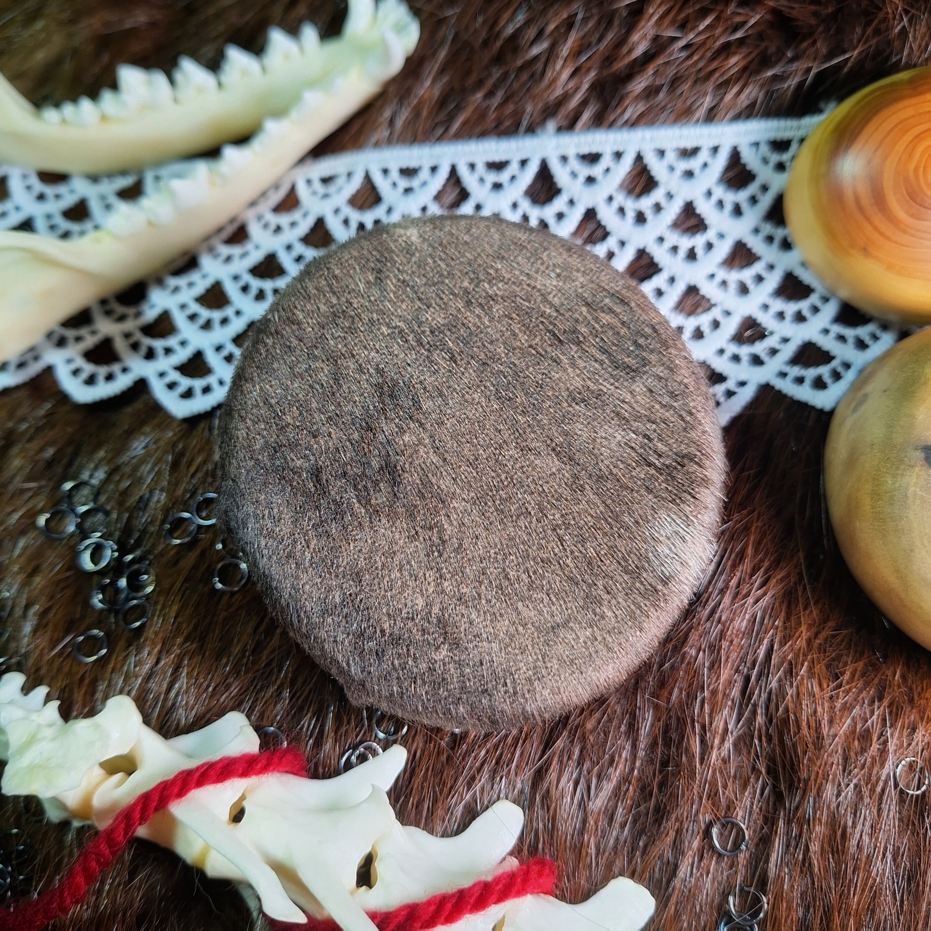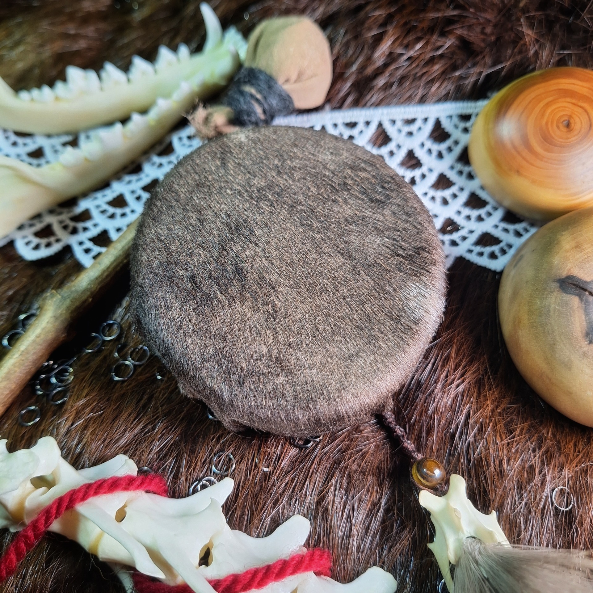 Malý rituální ruční bubínek, kapesní velikost do dlaně. Dřevěný kruh je z lípy, potah z kožešiny kozla, vázání voskovanou šňůrou.