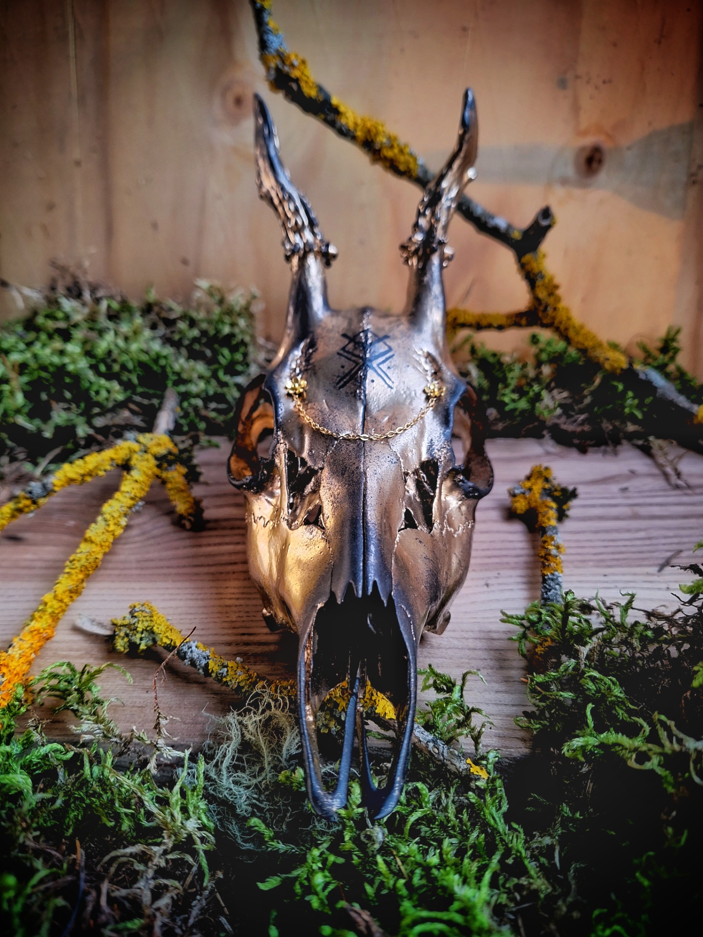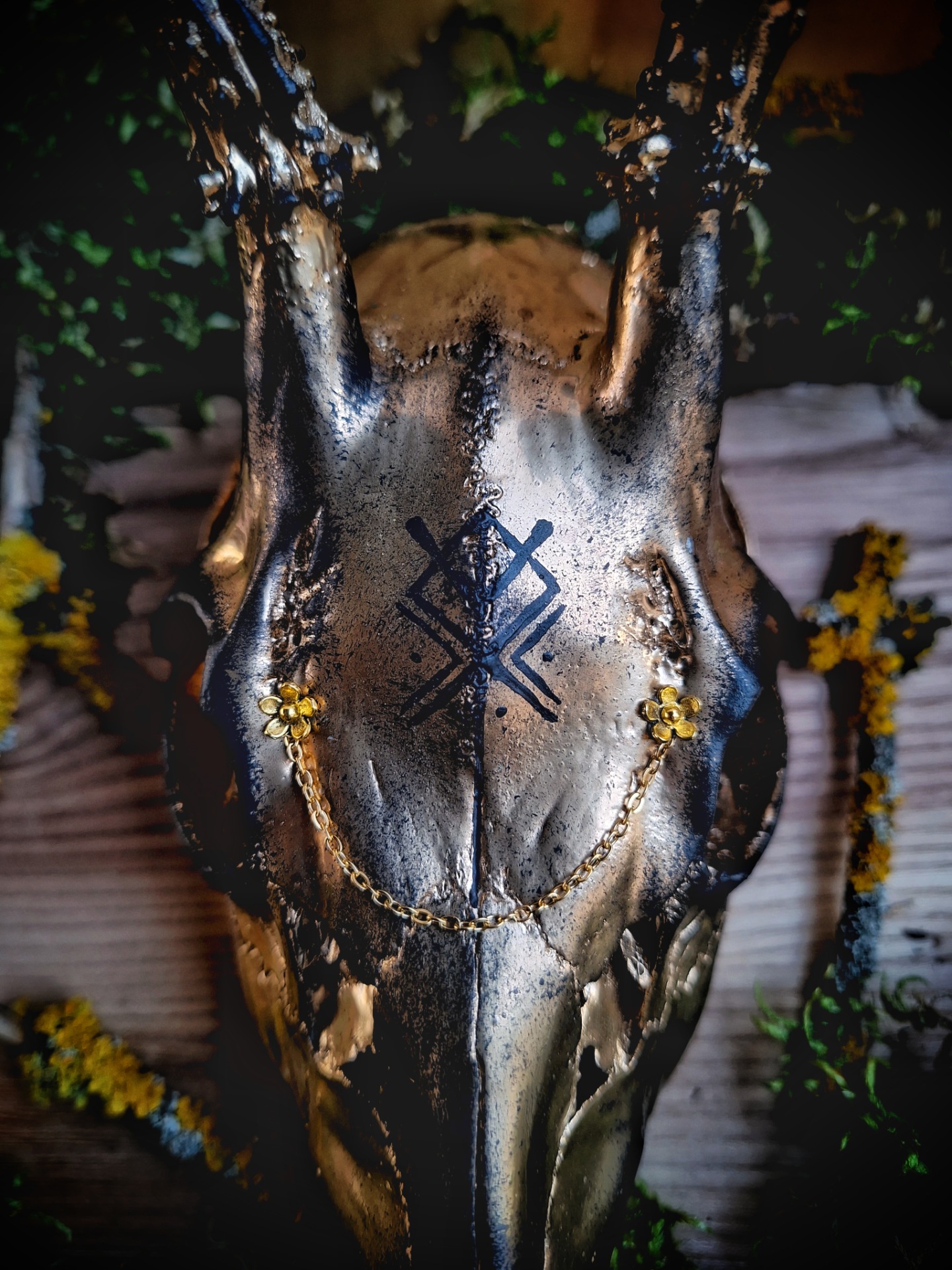 Lebky srnců s parohy nesou bindrunu složenou z run ALGIZ, KENAZ a OTHALA. Algiz je nejsilnější ochrannou runou, pevným štítem, košatým stromem, o který se můžeme opřít. Runa Kenaz je nejen hořící pochodní, jež osvětluje temnotu a odhání stíny, ale také vytváří ohnivý kruh, kterým zlo nepronikne. Othala je domovem, naším prostorem a rodinnou svatyní, jež je třeba chránit před nebezpečím zvenčí.