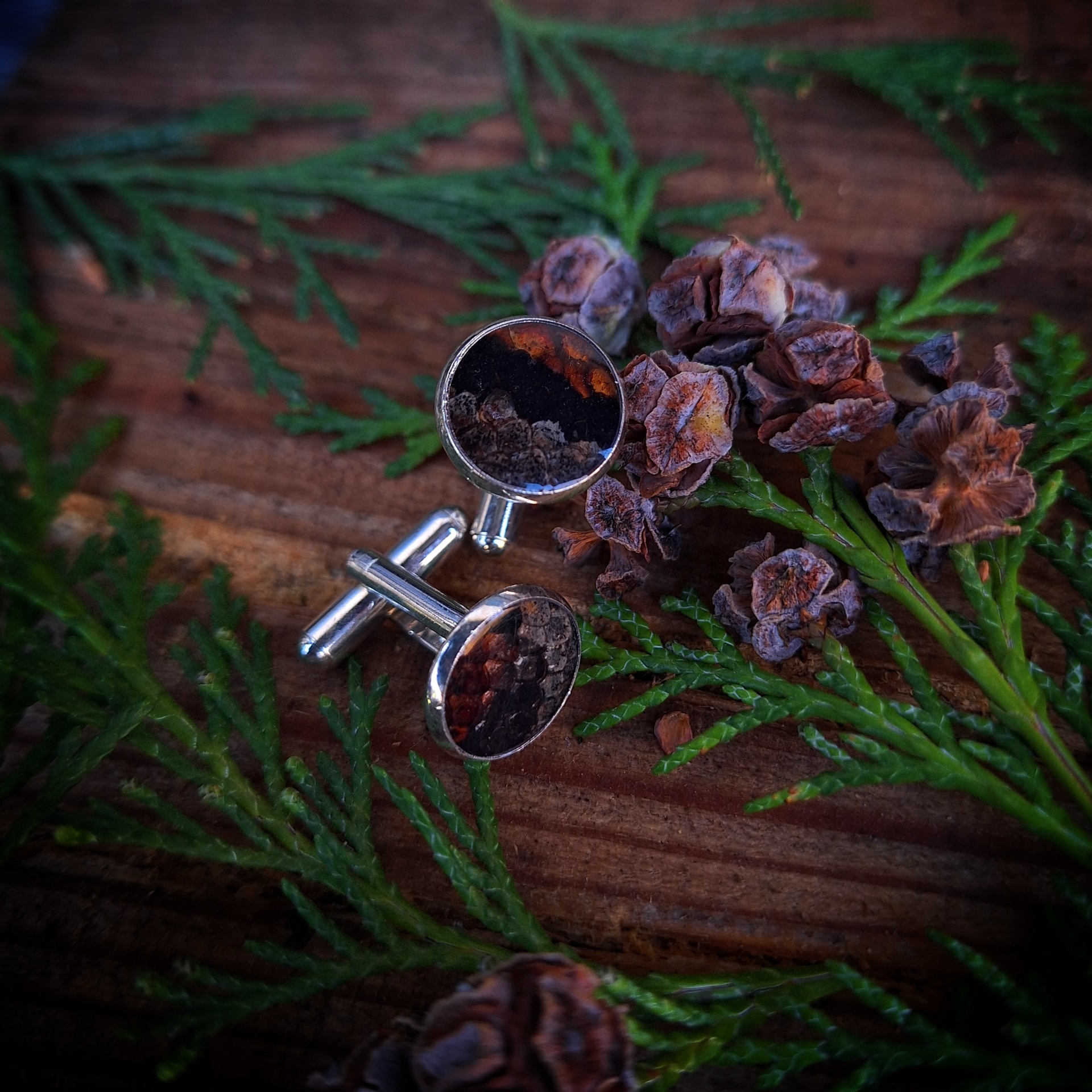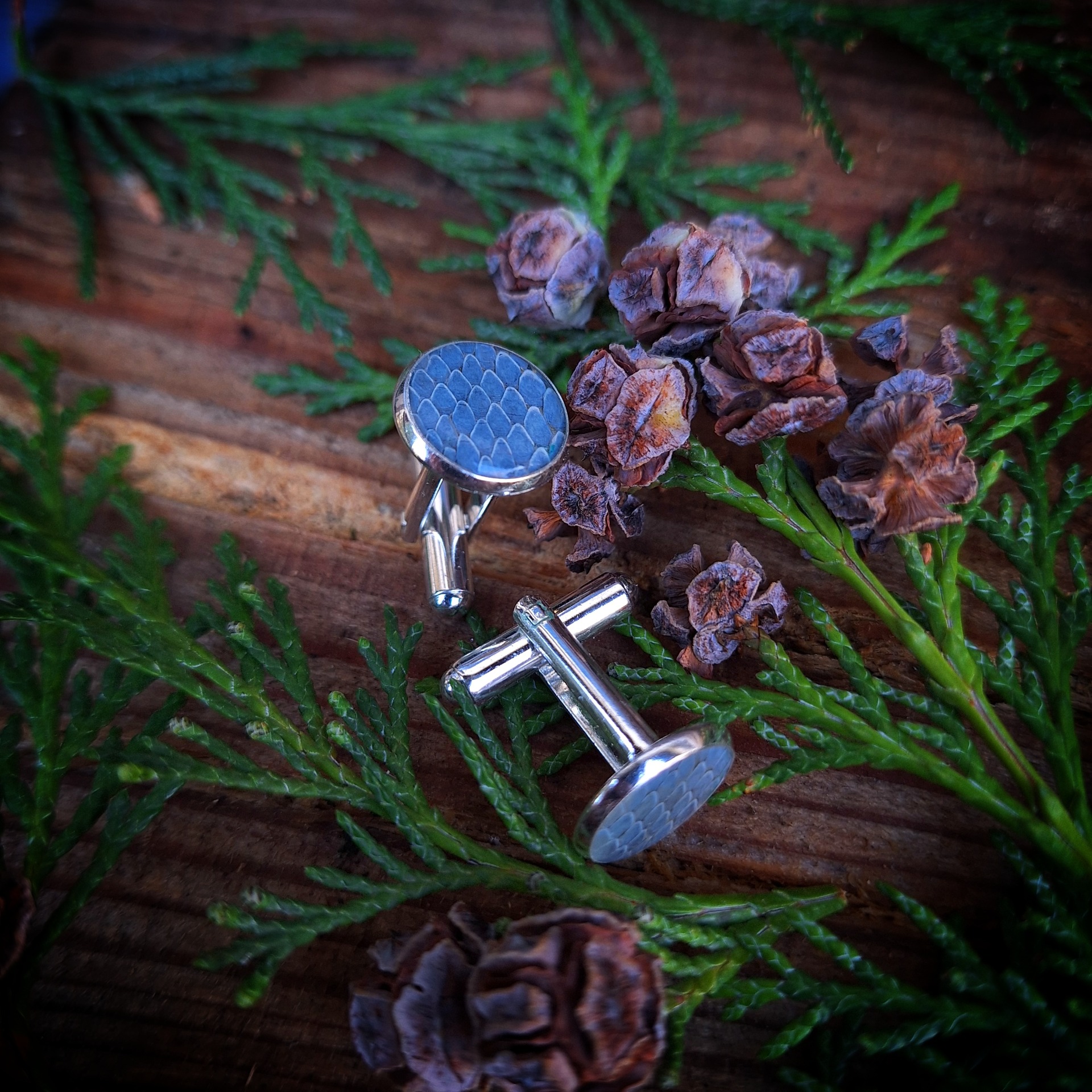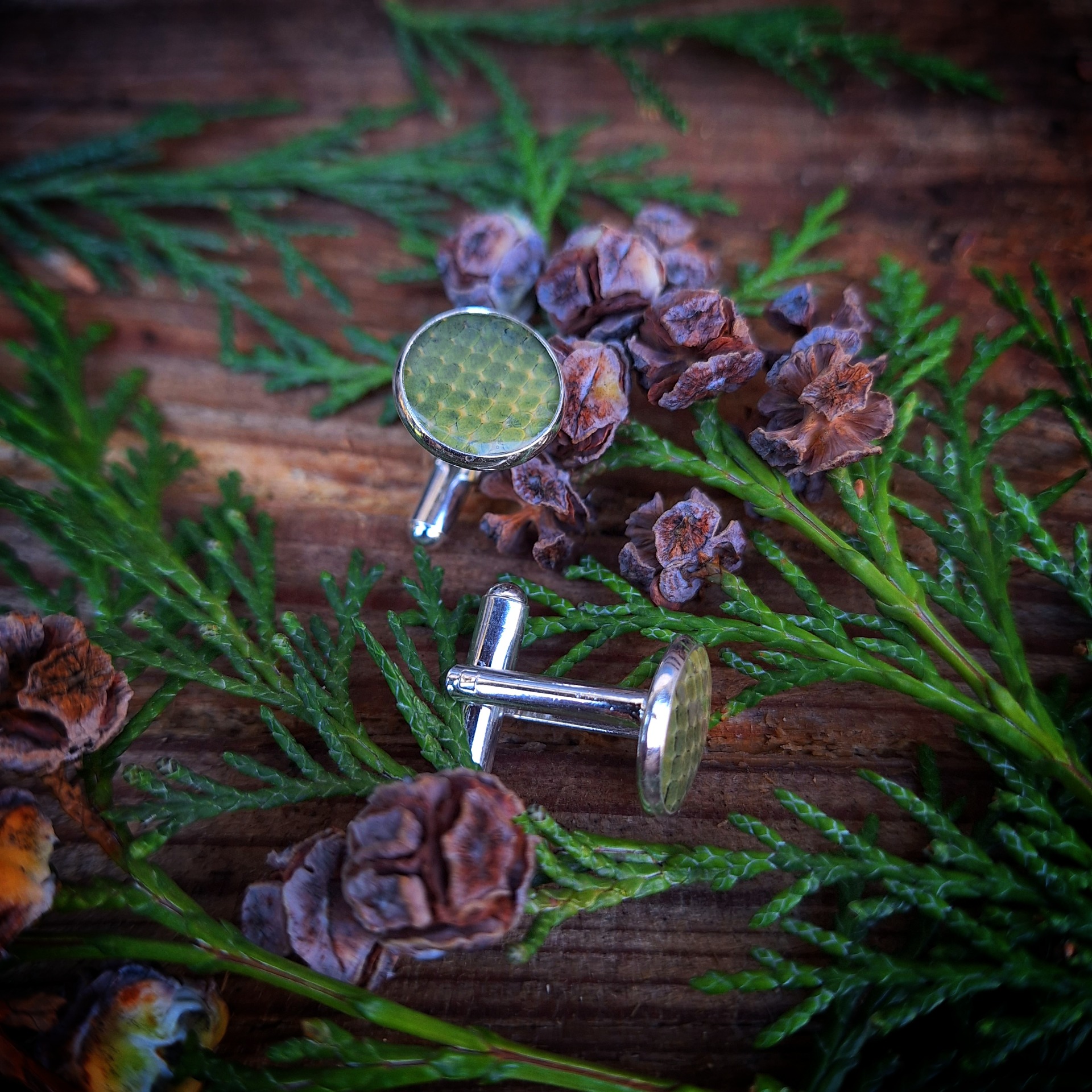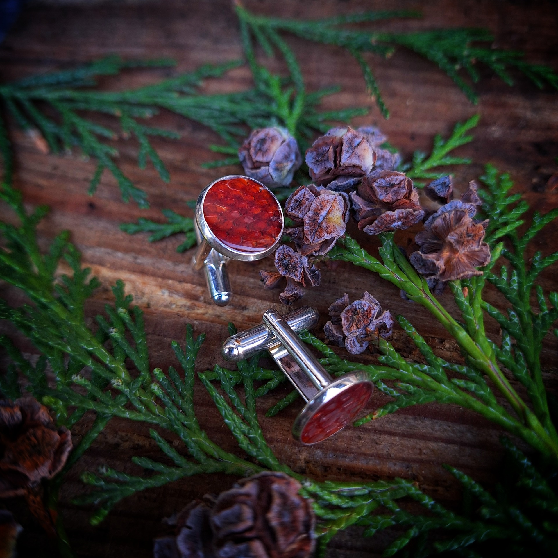 Hadí kůže pochází z přirozených úhynů z domácího chovu, je očištěná a vyčiněná. V kovovém lůžku je zafixovaná epoxidovou pryskyřicí. Lůžko je z bižuterního kovu s galvanizací.