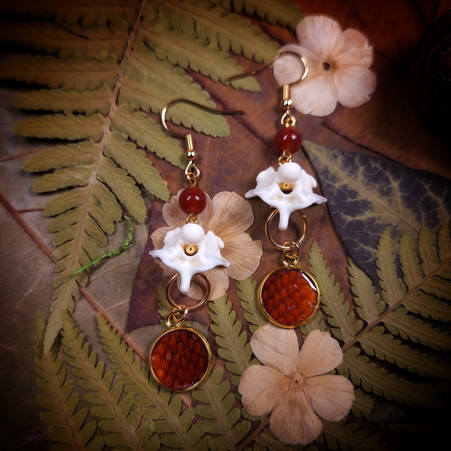 Náušnice s pravými hadími obratli krajty královské, korálky karneolu a pravou hadí kůží fixovanou epoxidovou pryskyřicí.