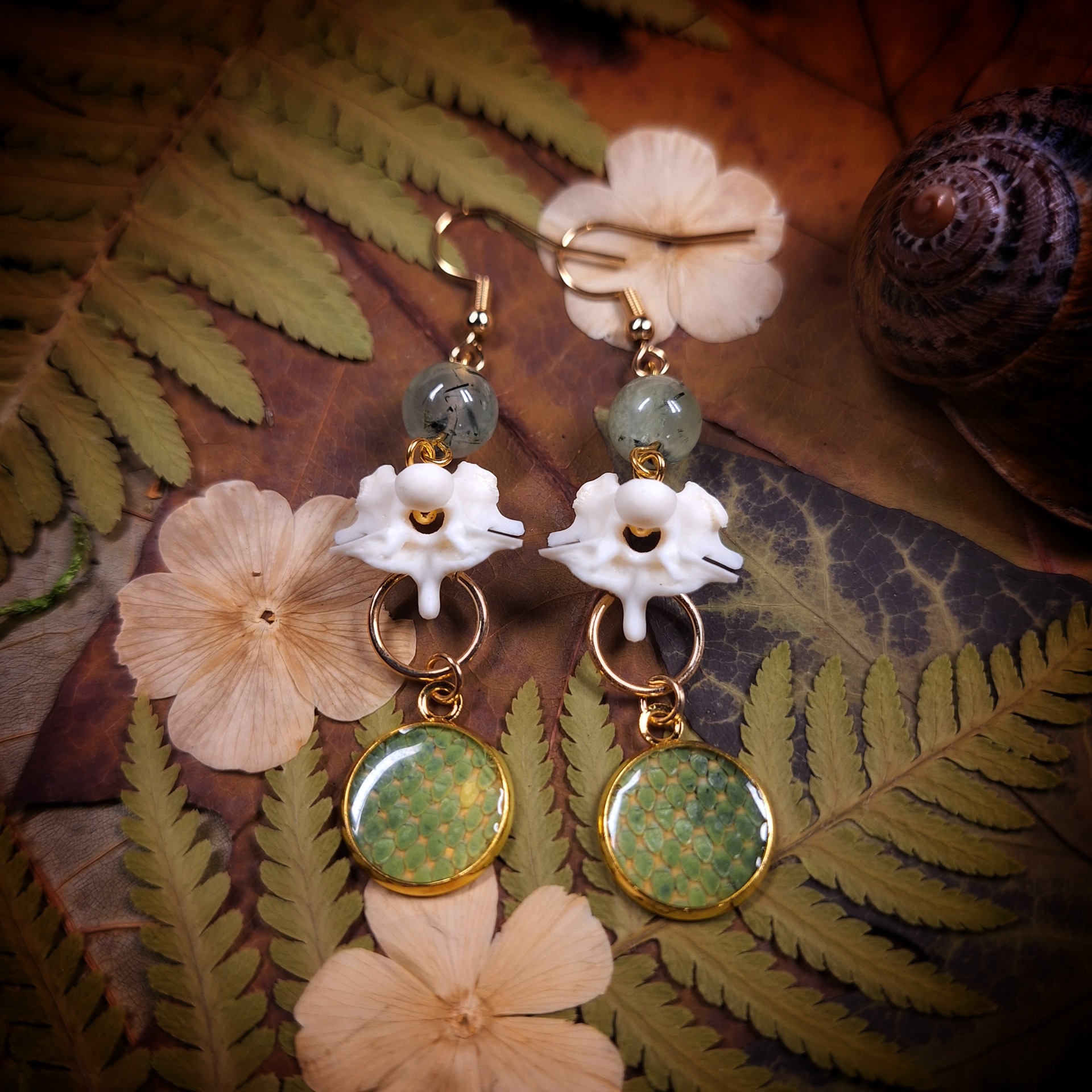 Náušnicové háčky jsou ze zlaté nerezové oceli, kosti pocházejí z přirozeného úhynu plaza v domácím chovu a jsou vyvařené, mechanicky a chemicky čištěné a bělené. Hadí kůže pochází z přirozených úhynů z domácího chovu, je očištěná a vyčiněná.