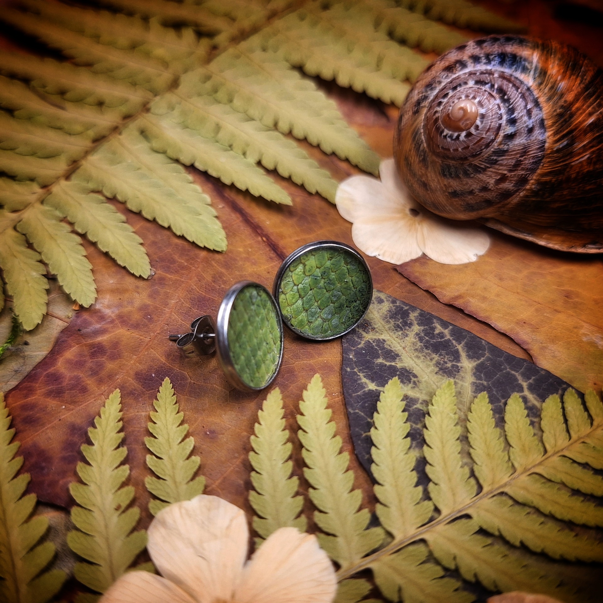 Puzetové náušnice s pravou kůží Psohlavce zeleného (Corallus caninus)