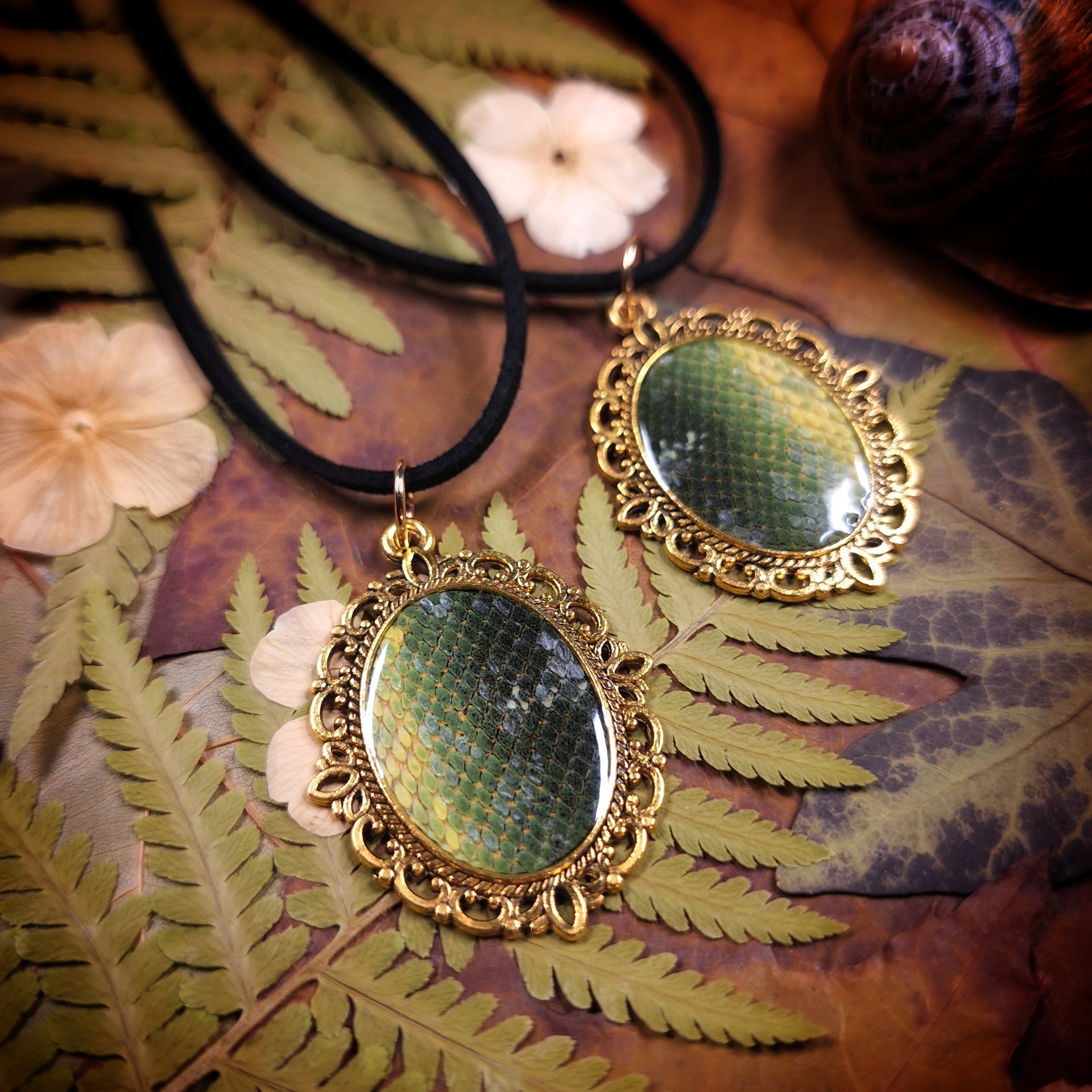 Hadí kůže pochází z přirozeného úhynu z domácího chovu, je očištěná a vyčiněná. V kovovém lůžku je zafixovaná epoxidovou pryskyřicí. Lůžko je z bižuterního kovu.