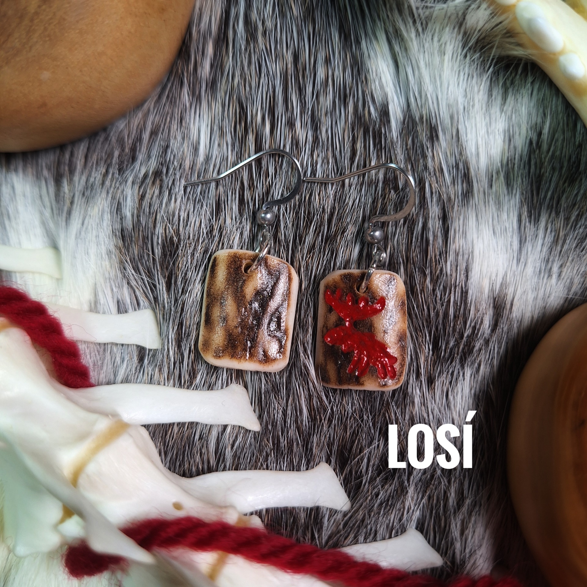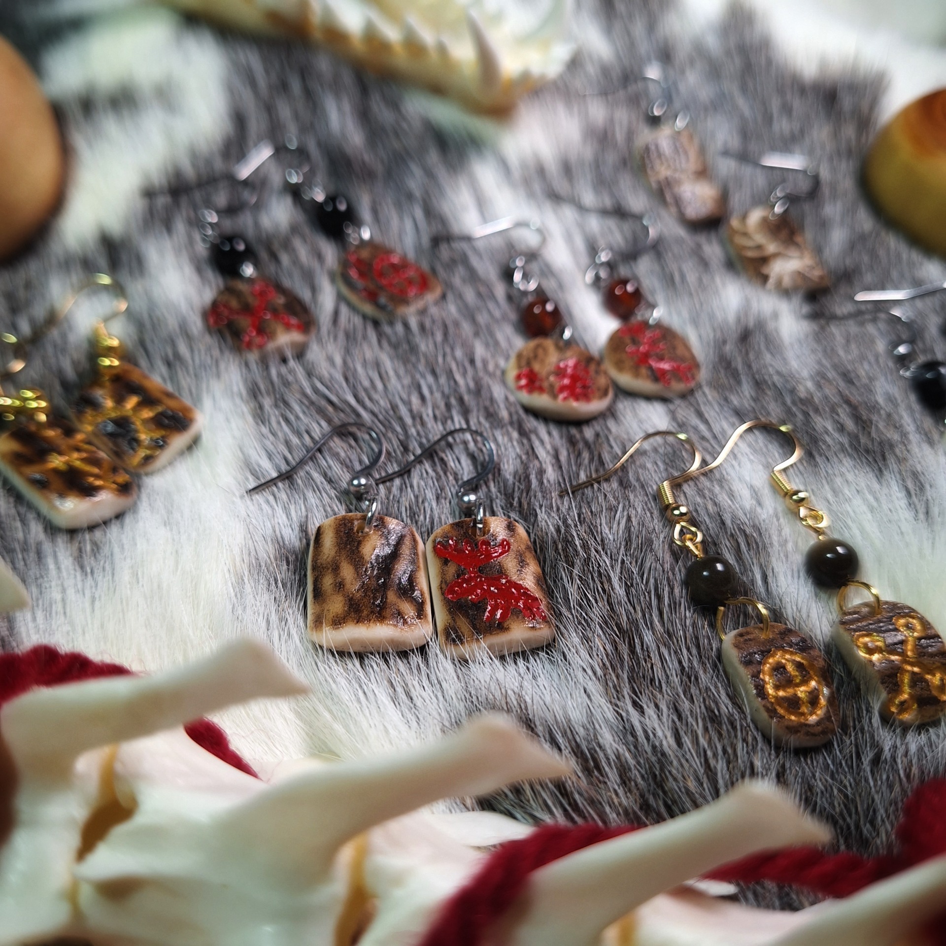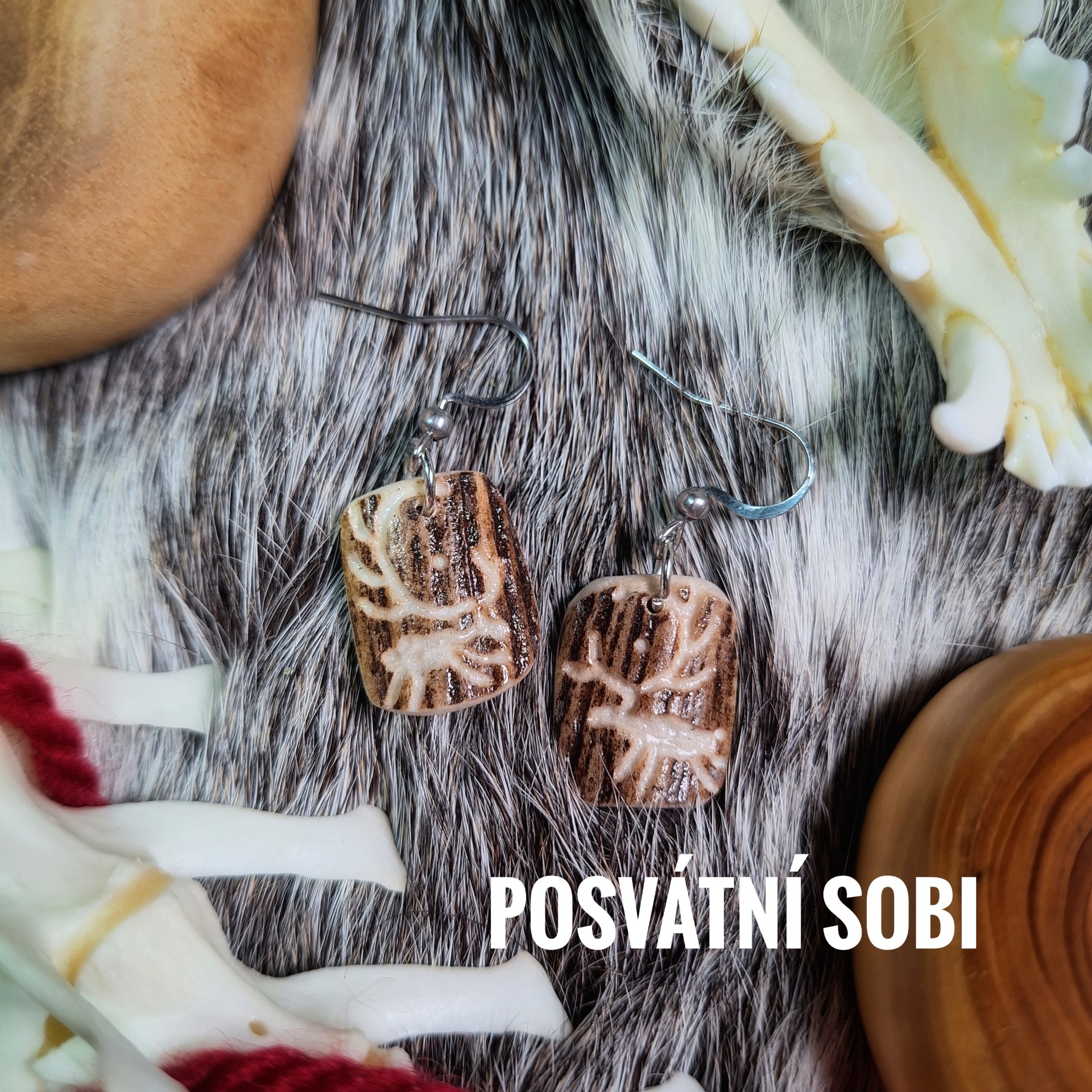 Nášnice z kousků jeleního paroží s gravírováním a barvou