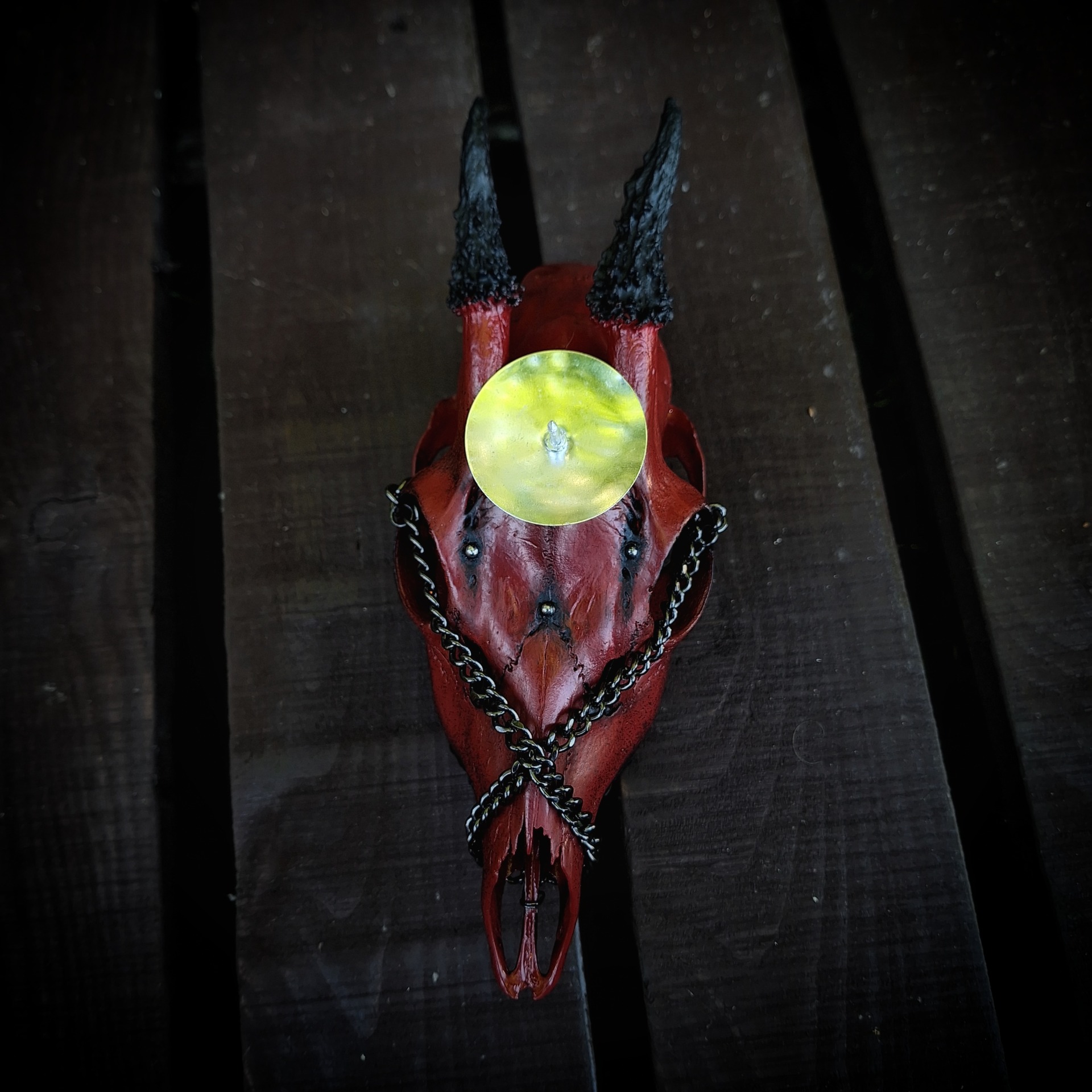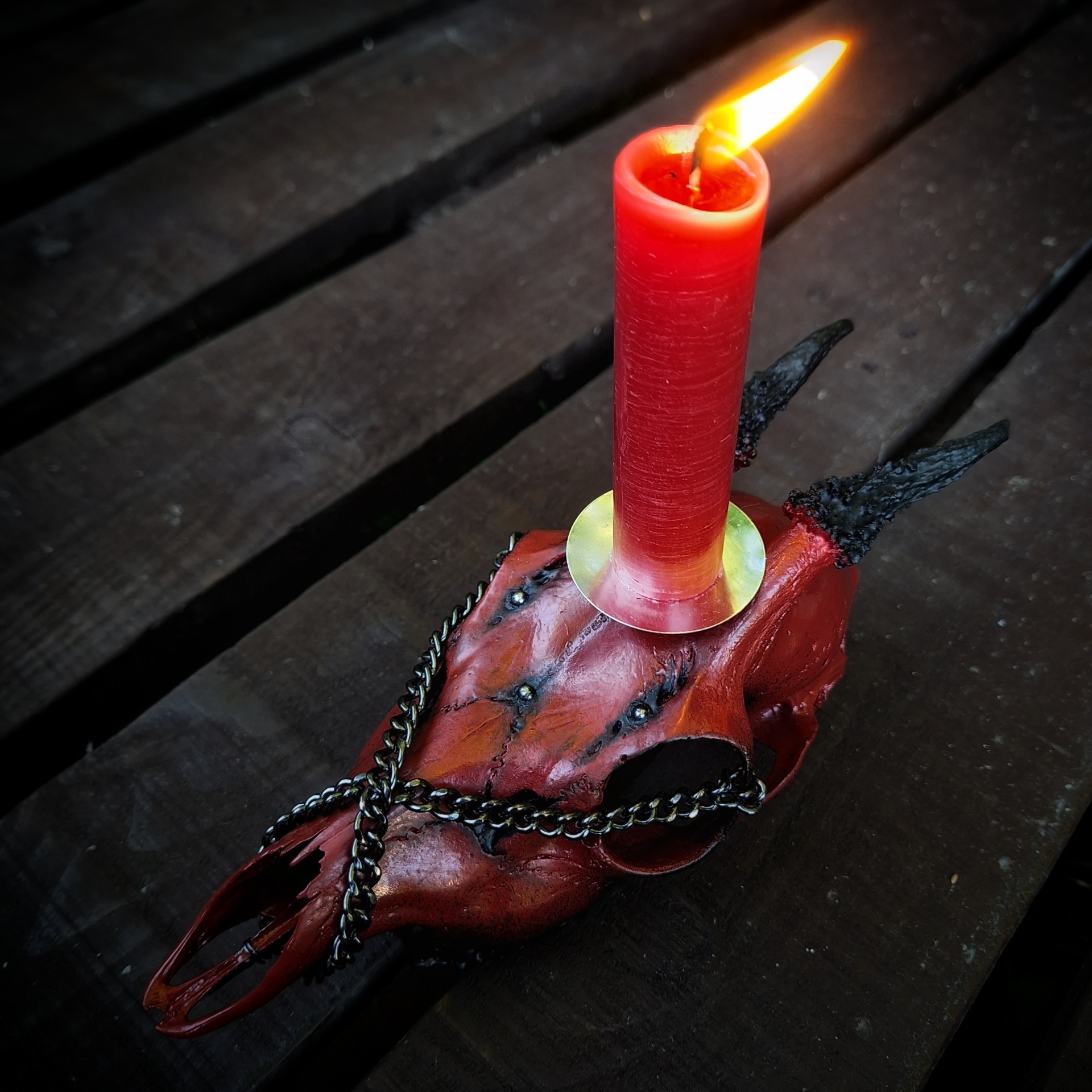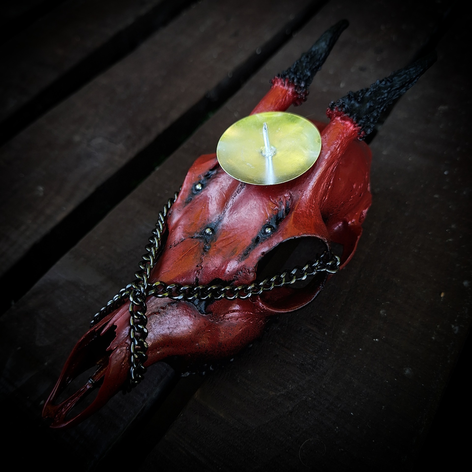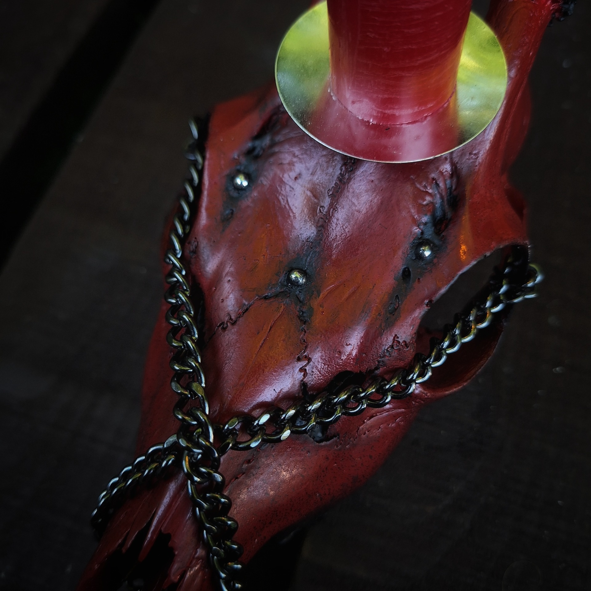 Svícen ze srnčí lebky zasvěcený Světlonoši, se zabroušenými ocelovými kuličkami, masivním řetězem a ocelovým bodcem na svíčku