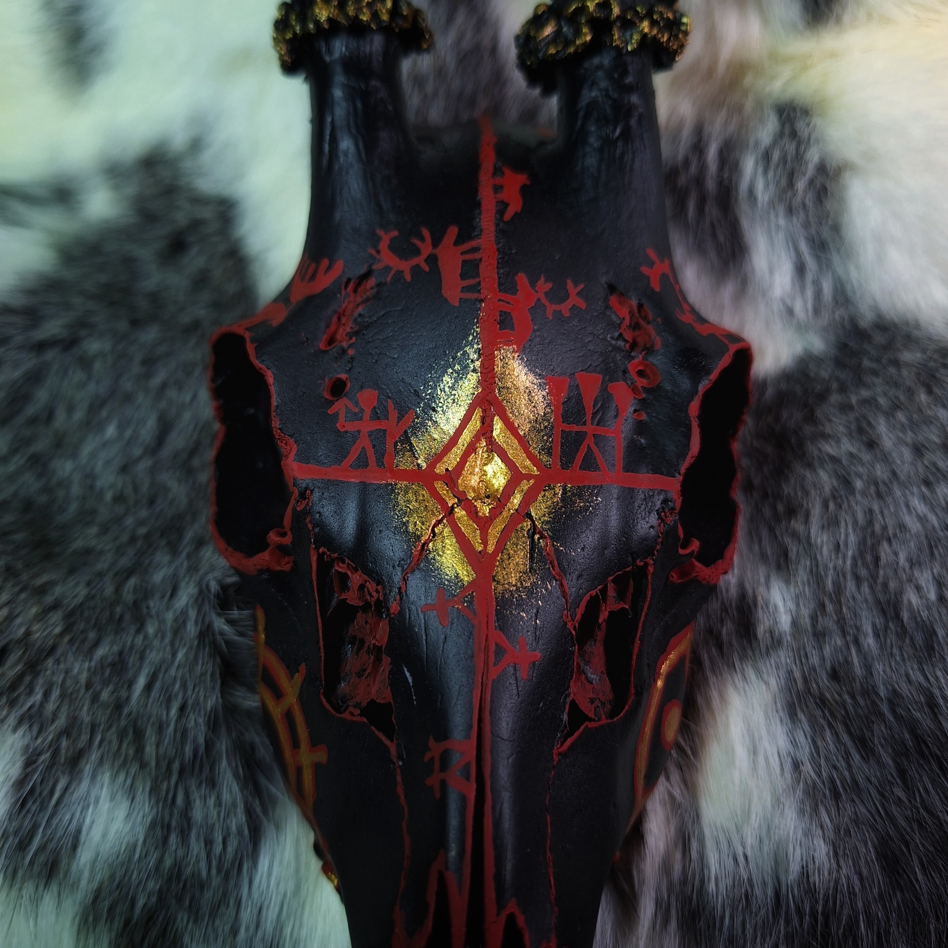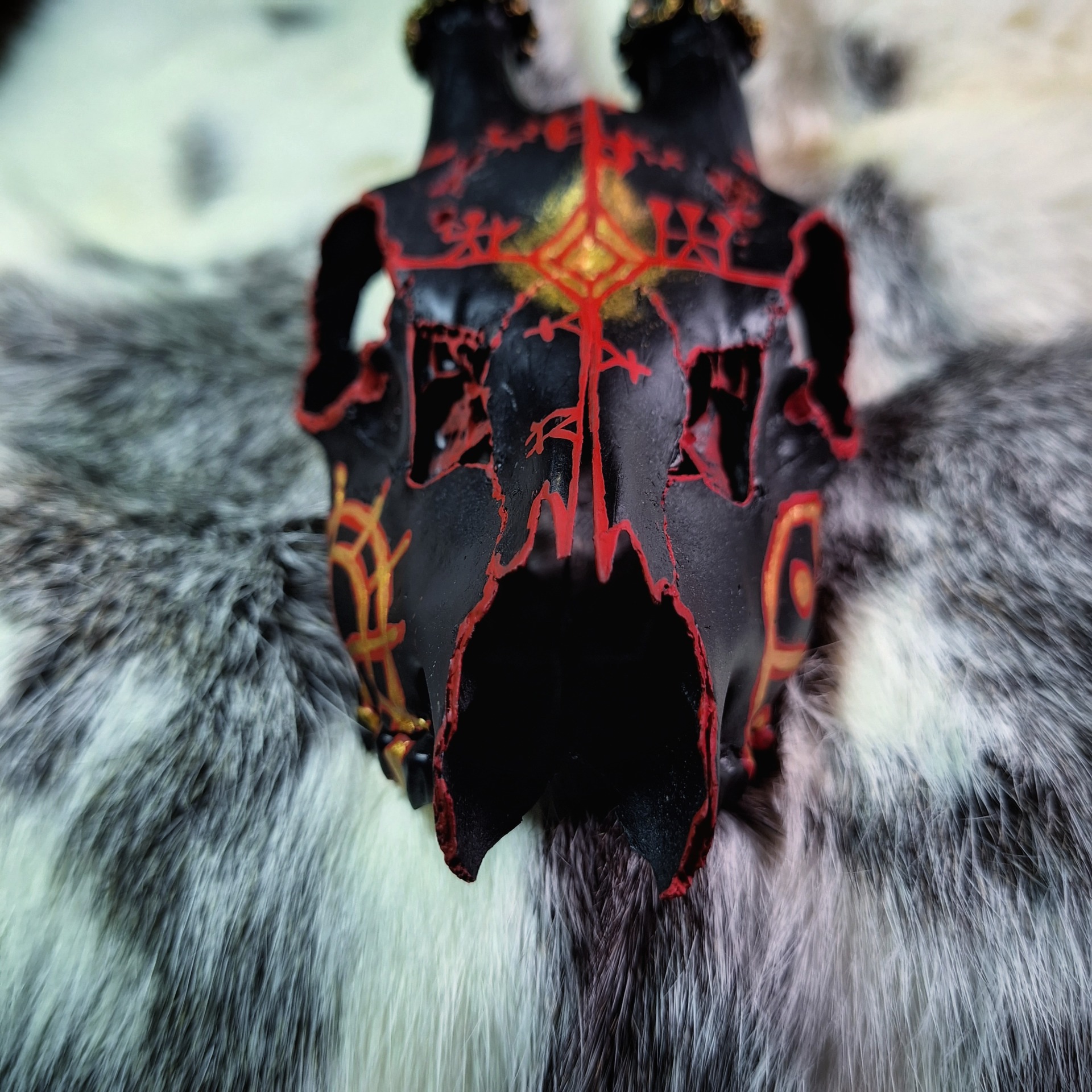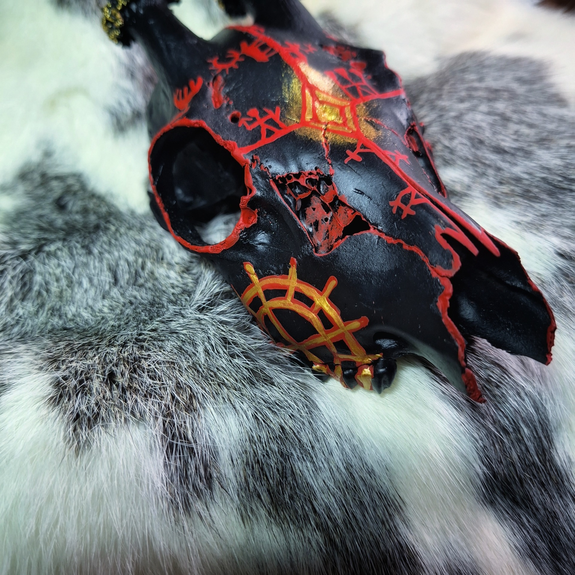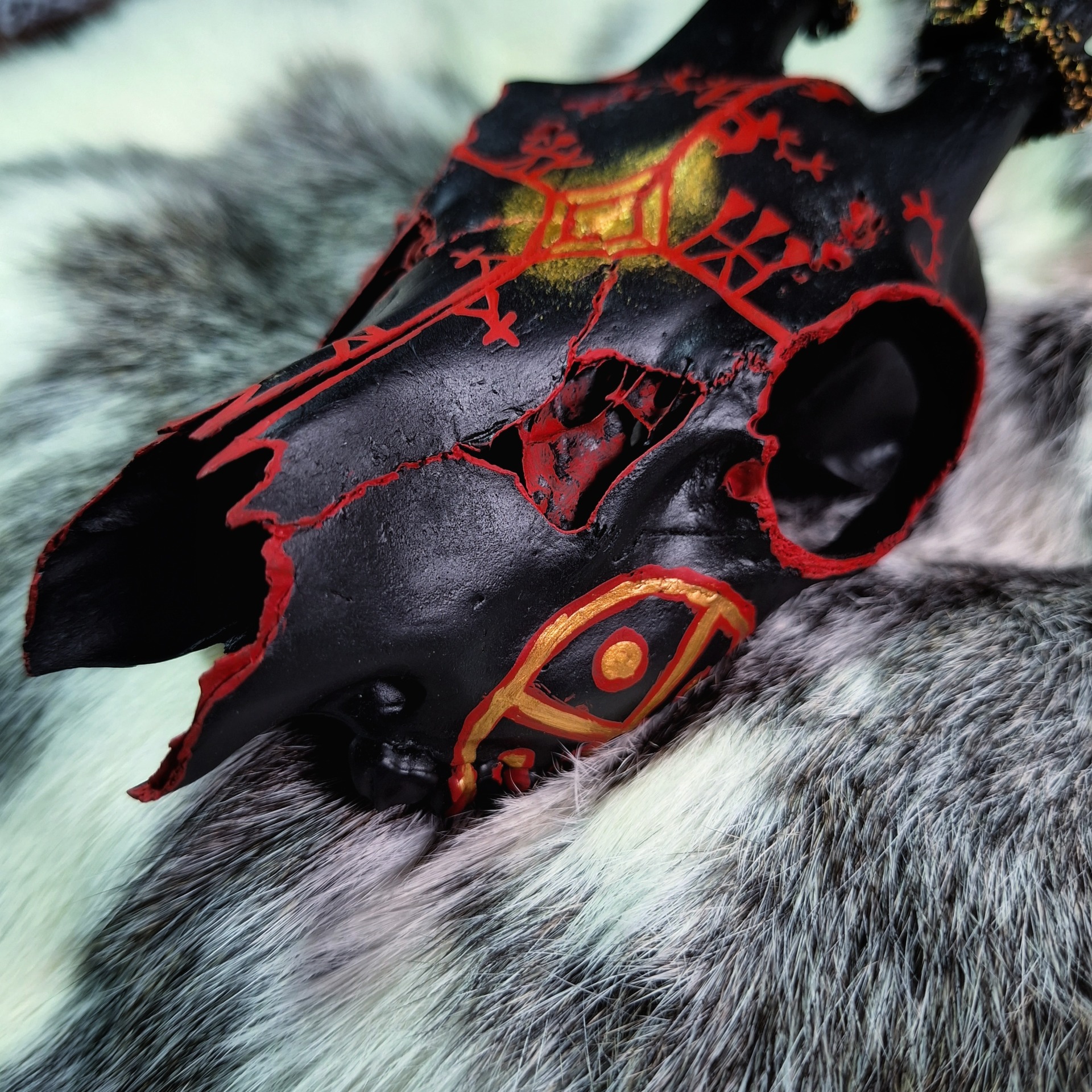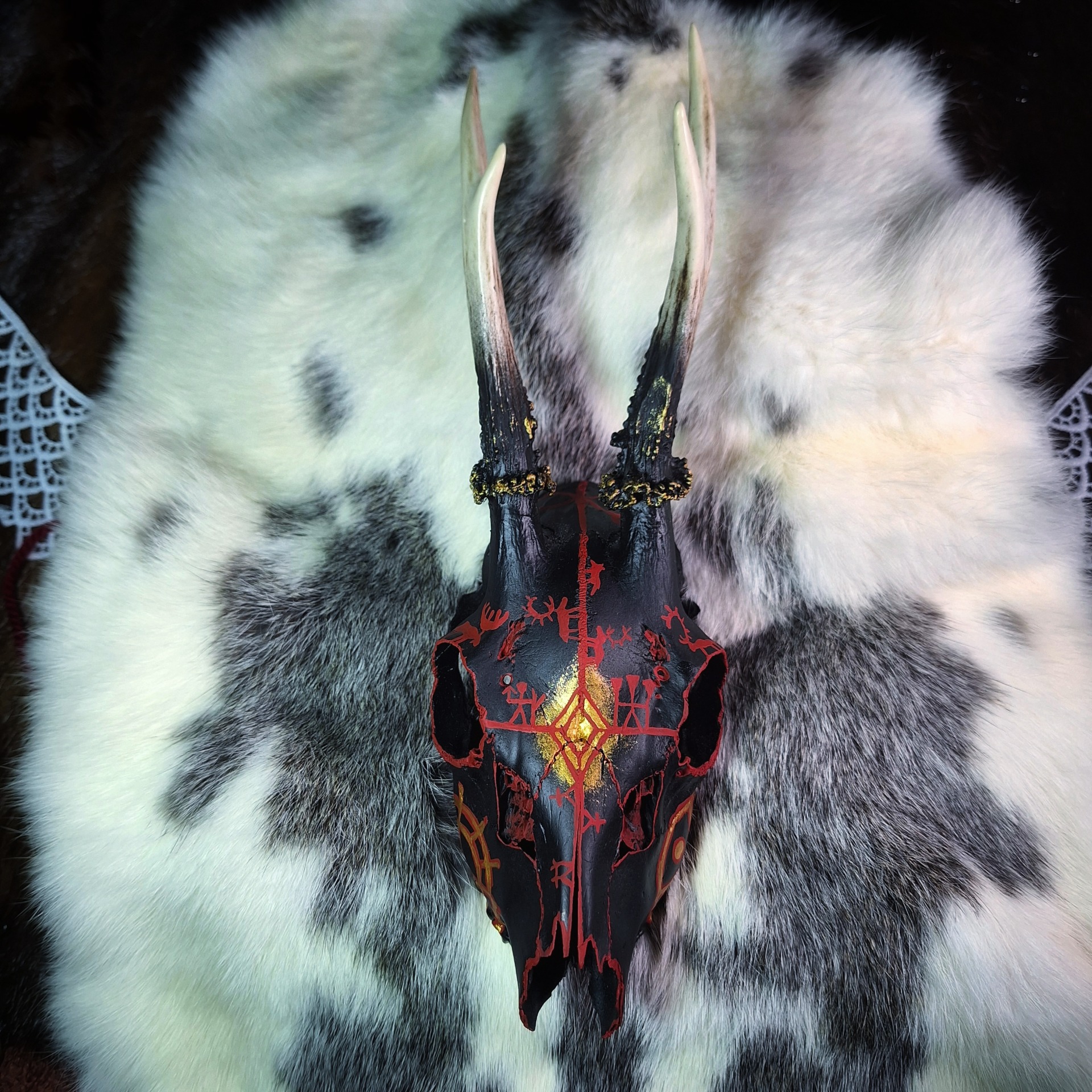 Oltářní lebka srnce s ruční malbou inspirovanou sámskými šamanskými bubínky