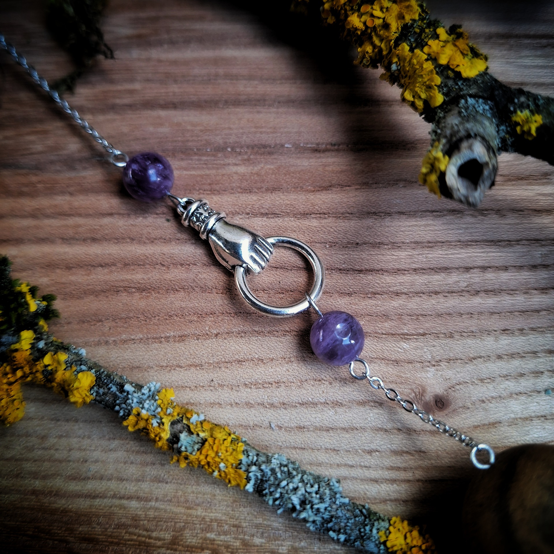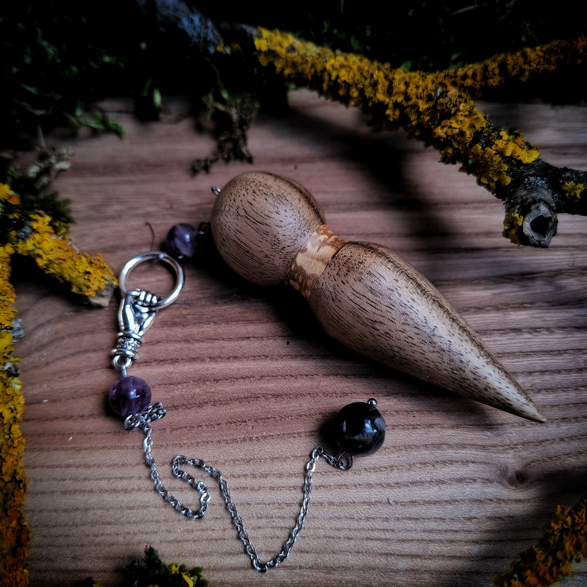 Ručně broušené kyvadlo ze dřeva ořešáku evropského s proložkou ze spaltovaného buku s ametysty.