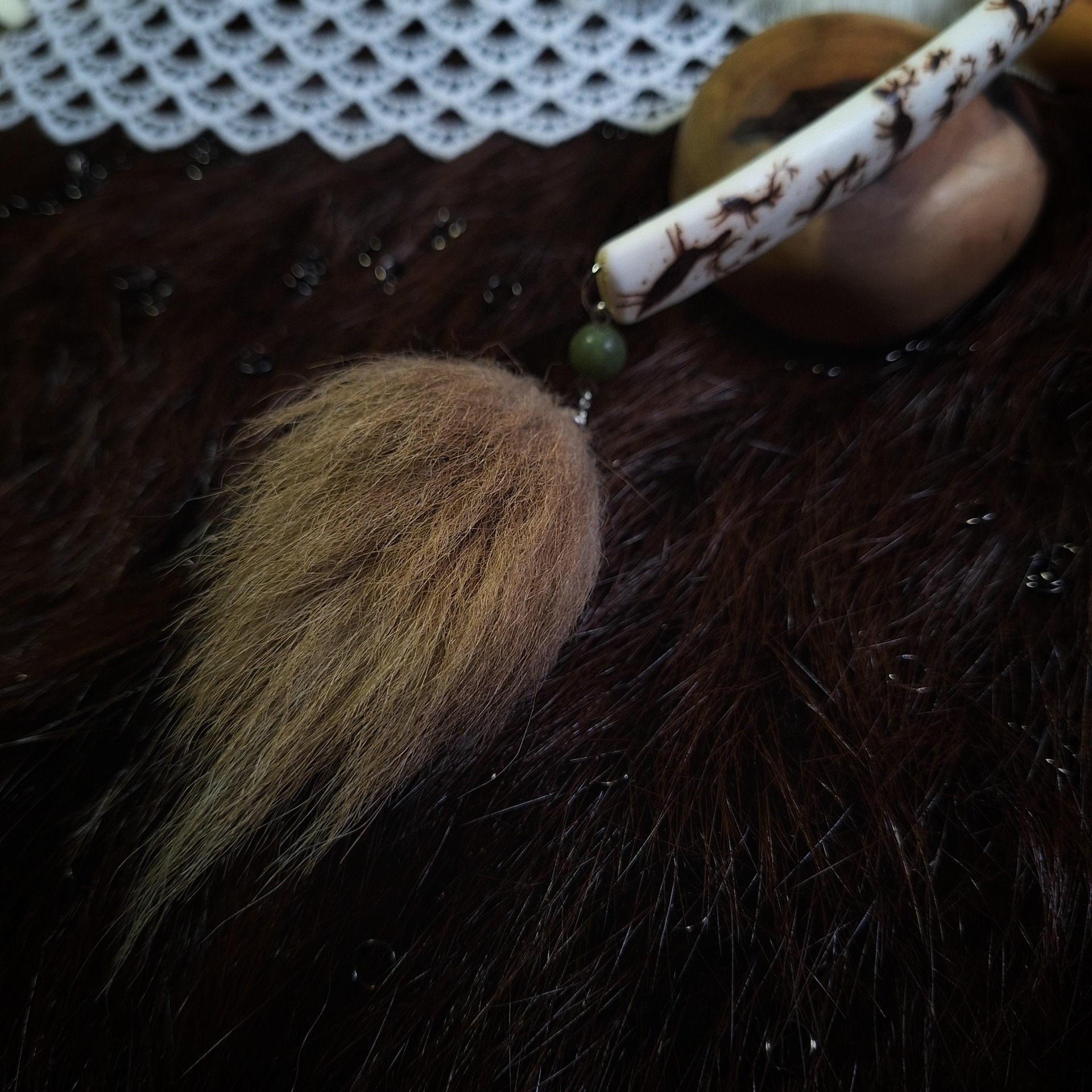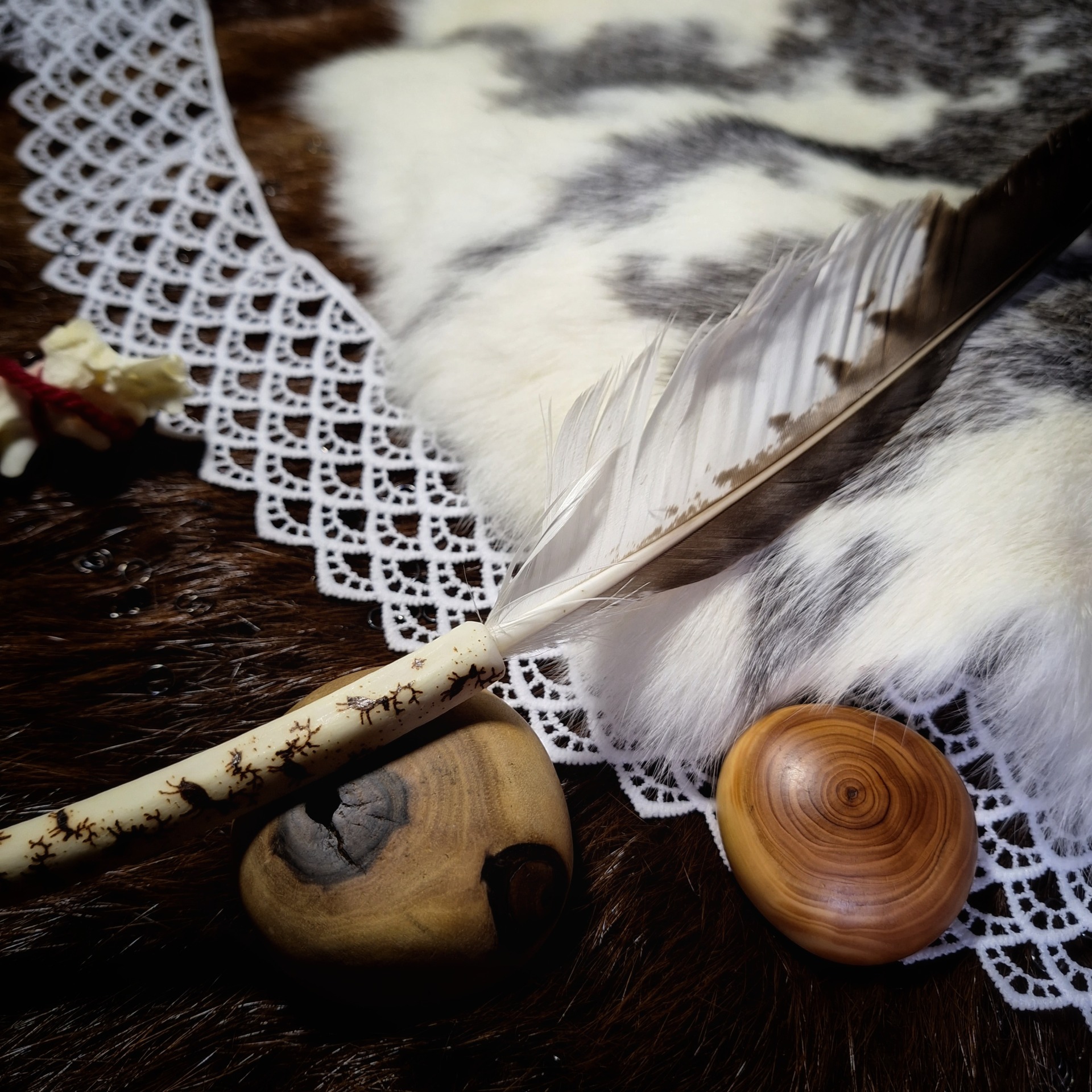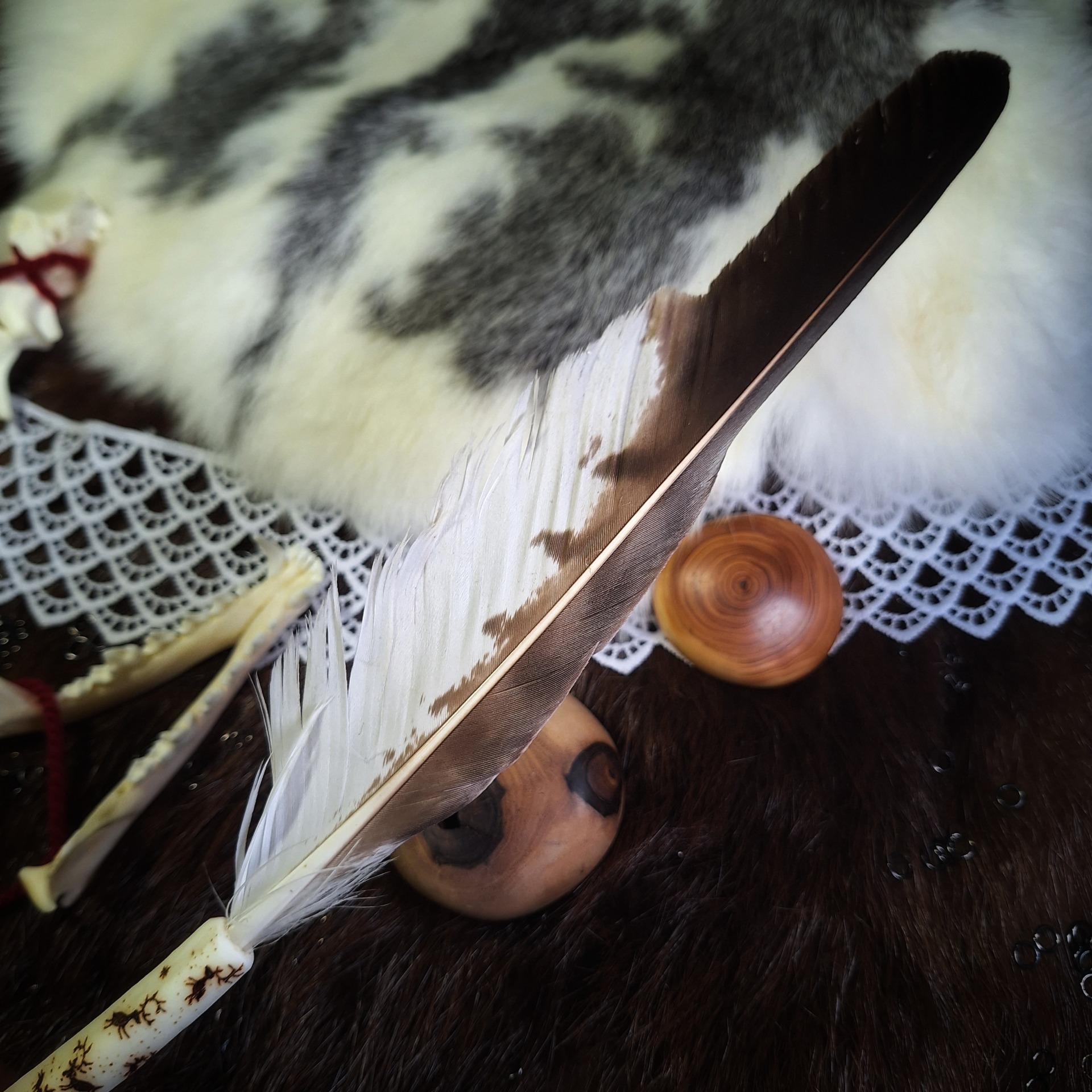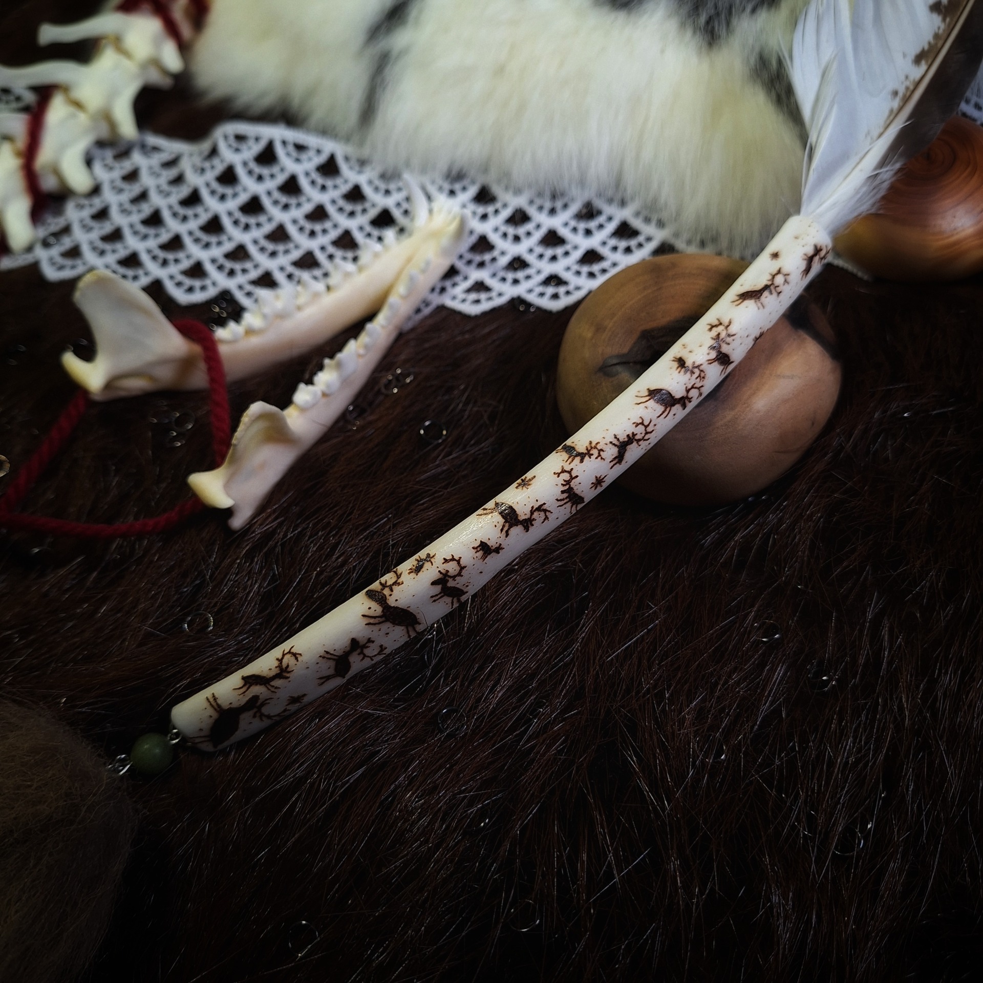 Vykuřovací pírko z jestřába zasazené do jeleního parohu zdobeného ruční pyrografií, s nefritem a špičkou liščího ocasu