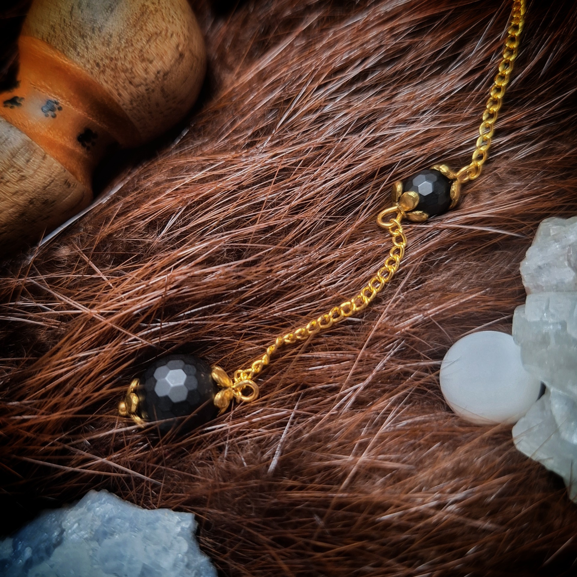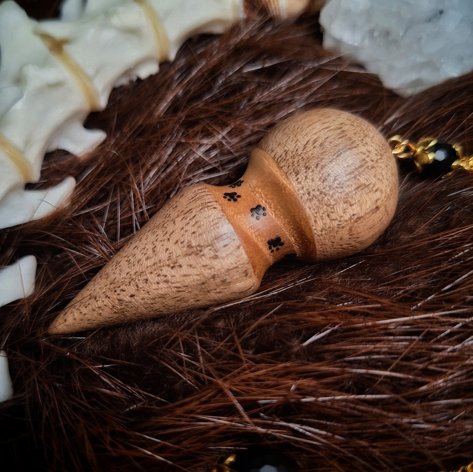Kyvadlo kočičího průvodce a ochránce z jasanu a ořešáku s broušenými matnými onyxy.