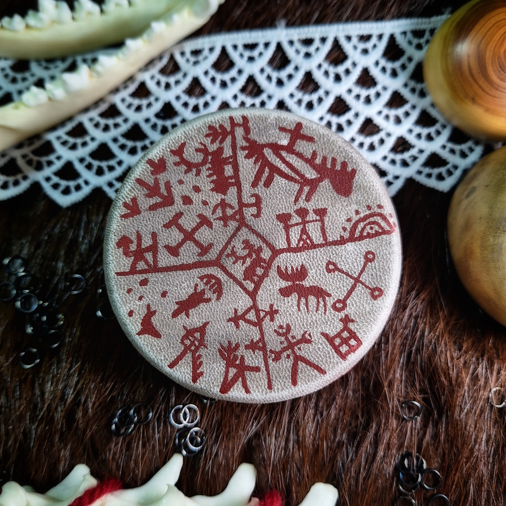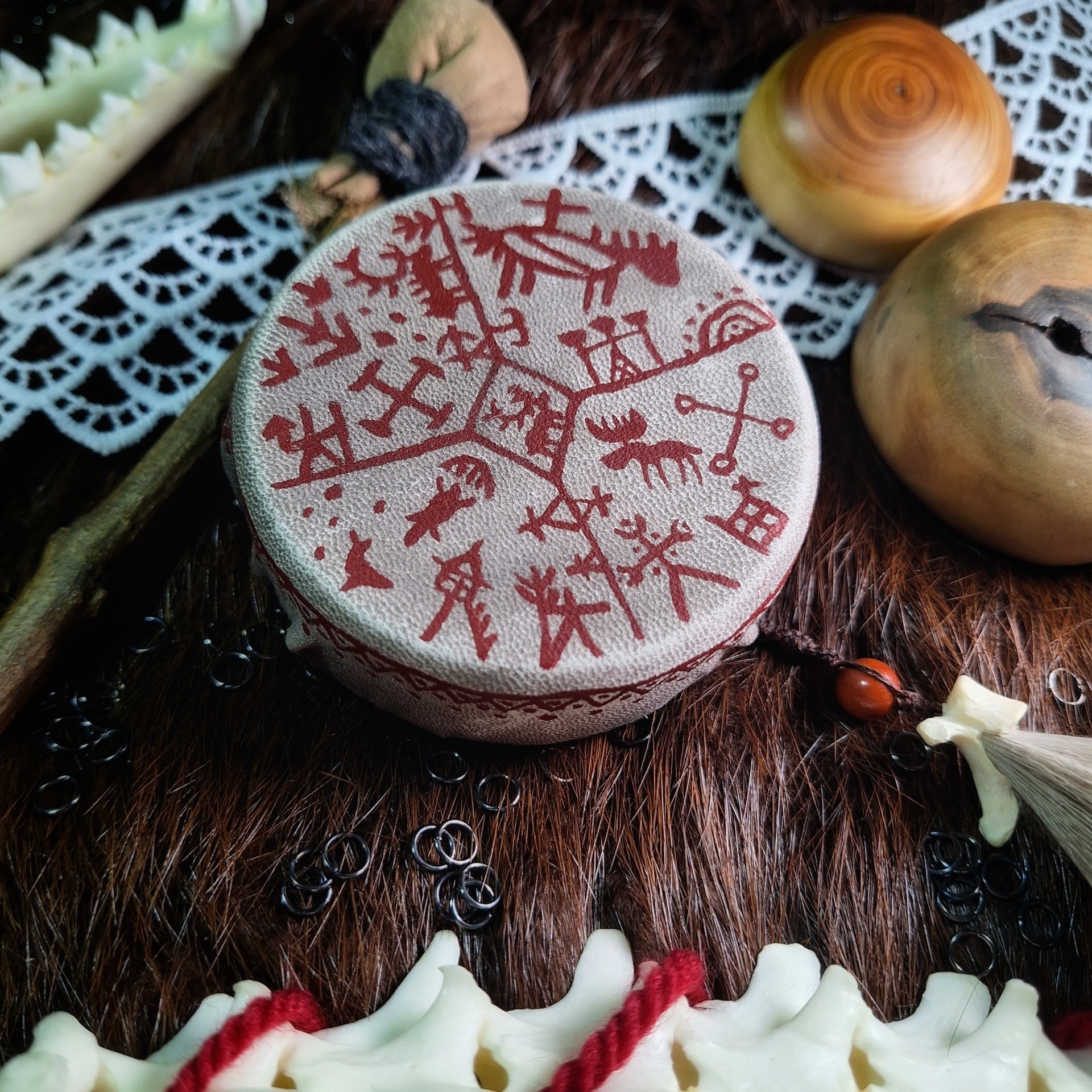 Malý rituální ruční bubínek, kapesní velikost do dlaně. Dřevěný kruh je z lípy, potah z kůže kozla, vázání voskovanou šňůrou. Ruční malba speciálními barvami na useň.