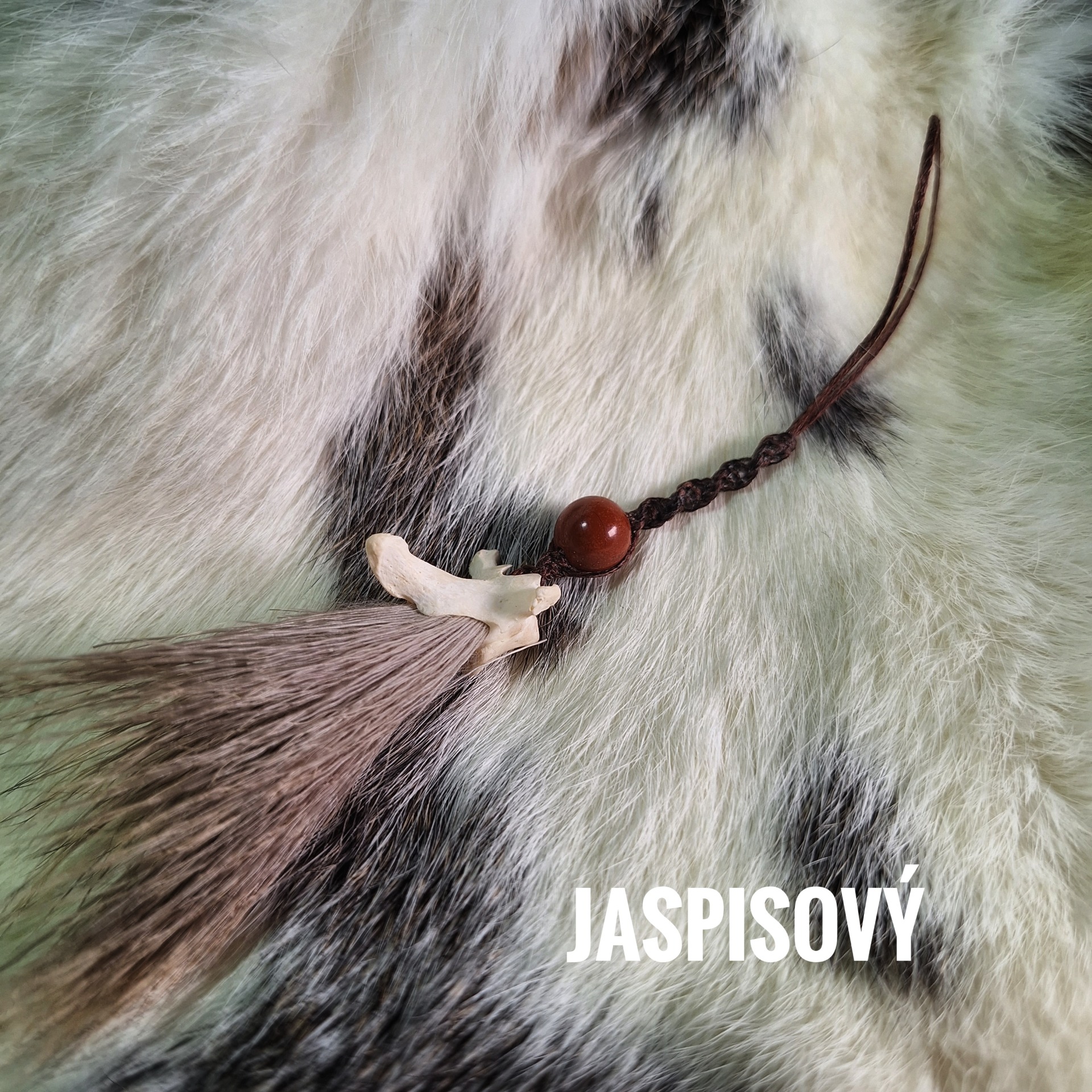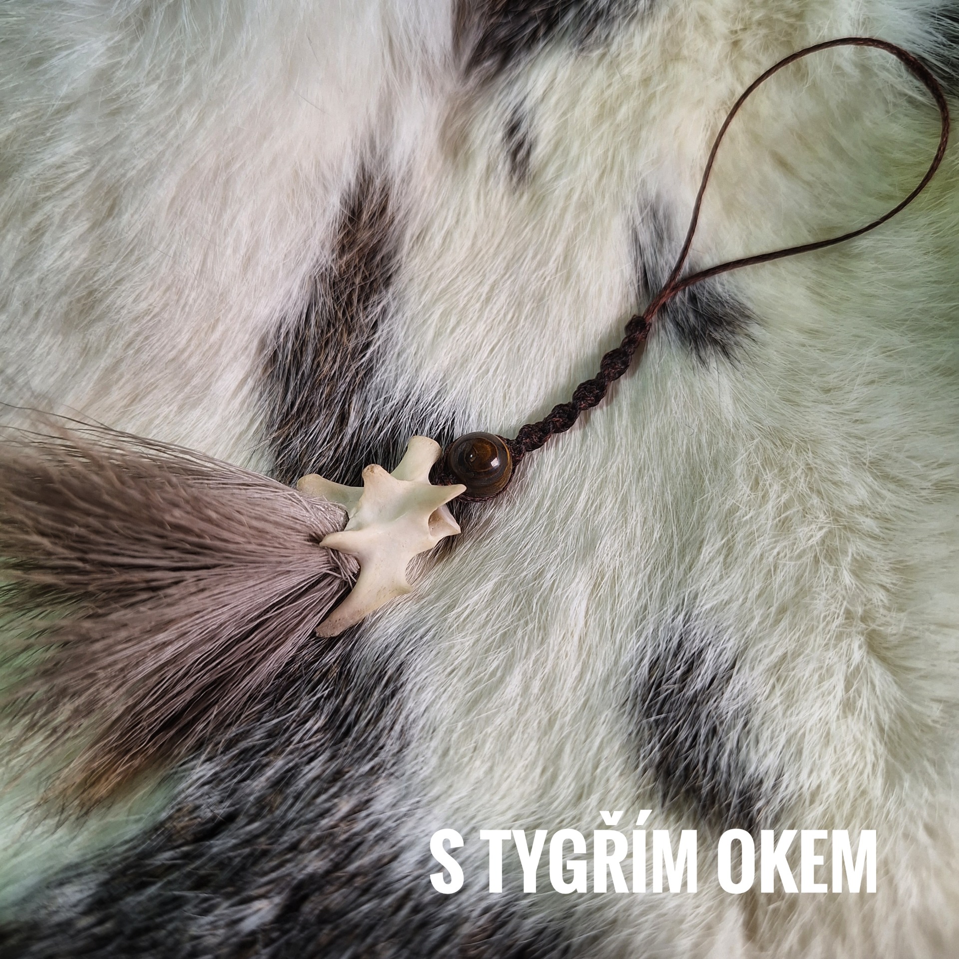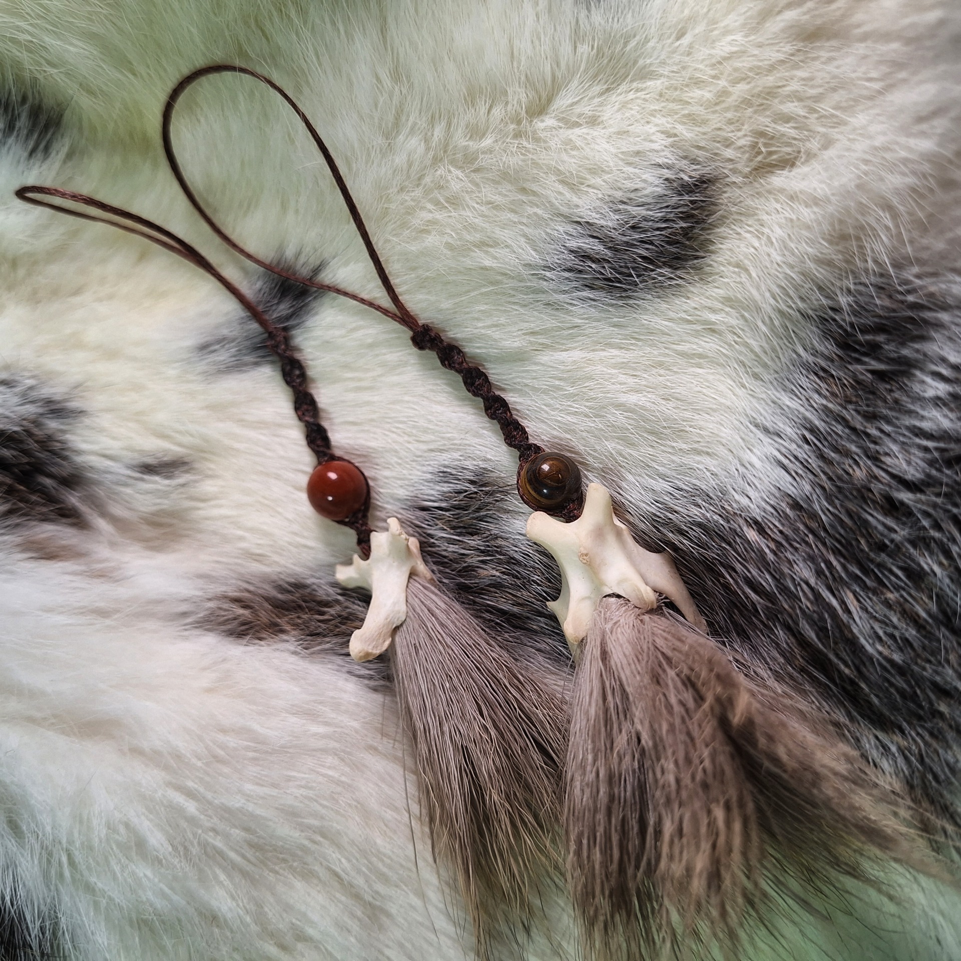 Rituální ověšky na ruční bubínky ze splétané voskované šňůry s minerály, obratly kuny a jelení kožešinkou.