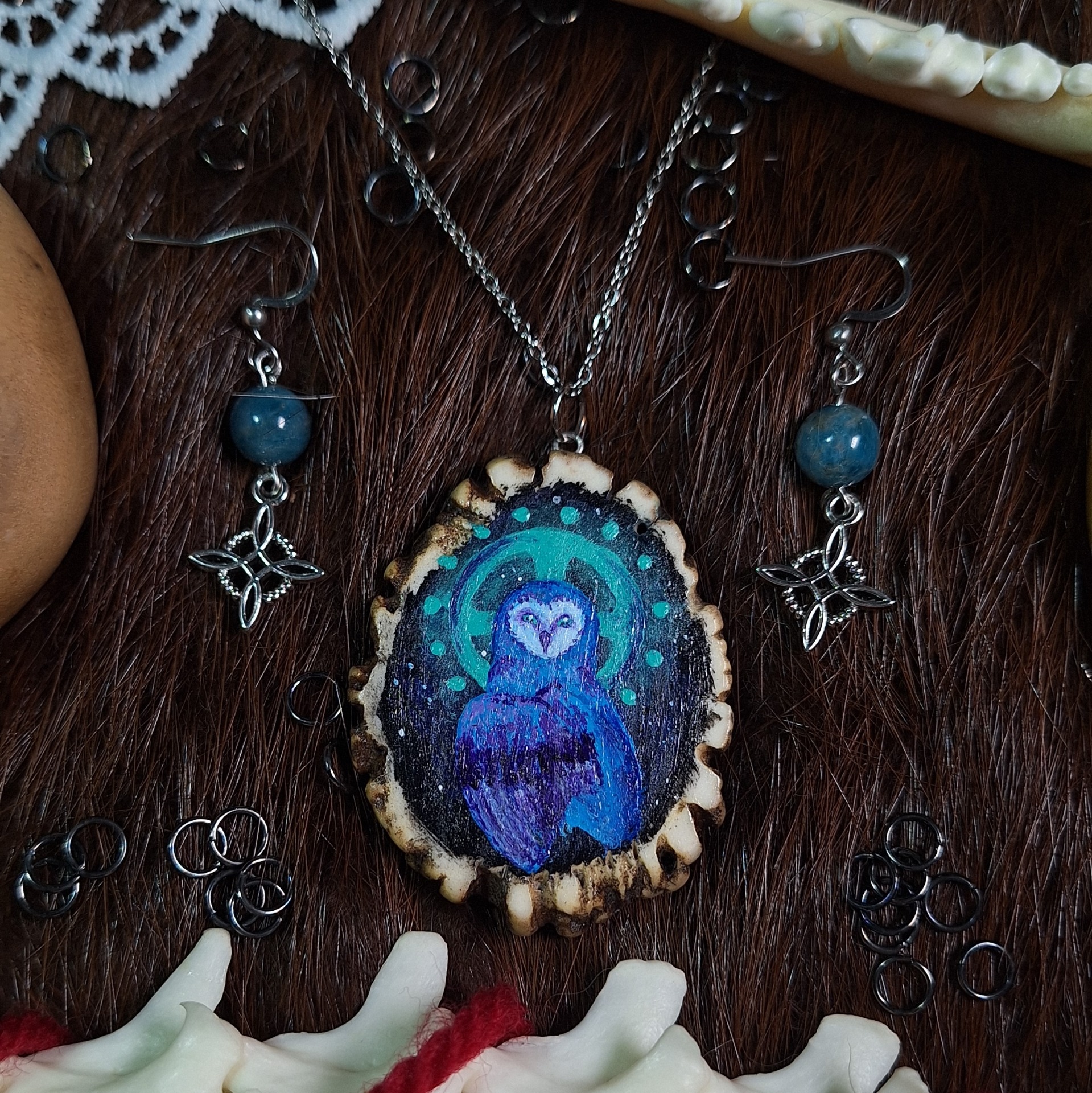Ruční malba sovy na růži z jeleního parohu, v setu s náušnicemi s apatitem. Limitovaný kus, unikát.