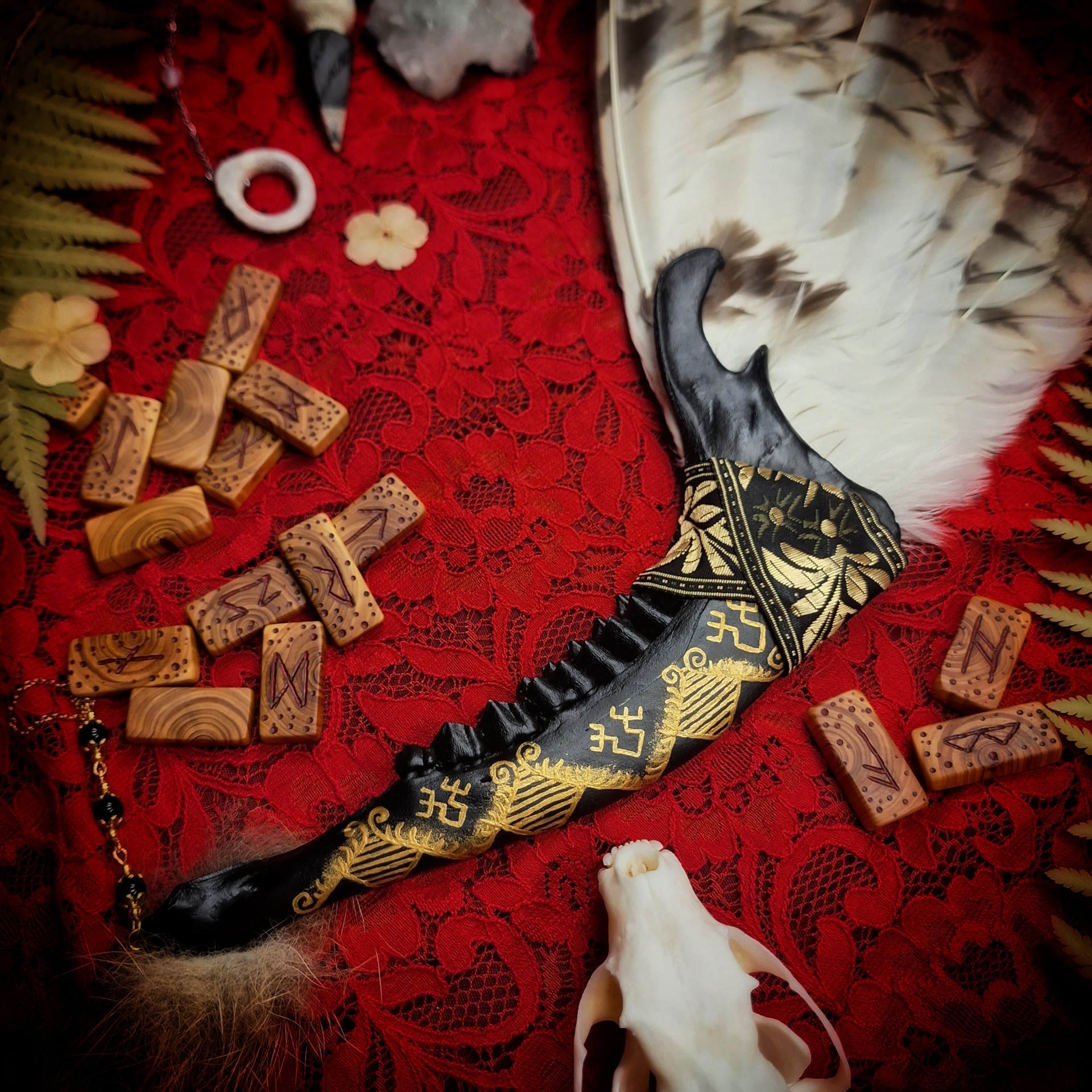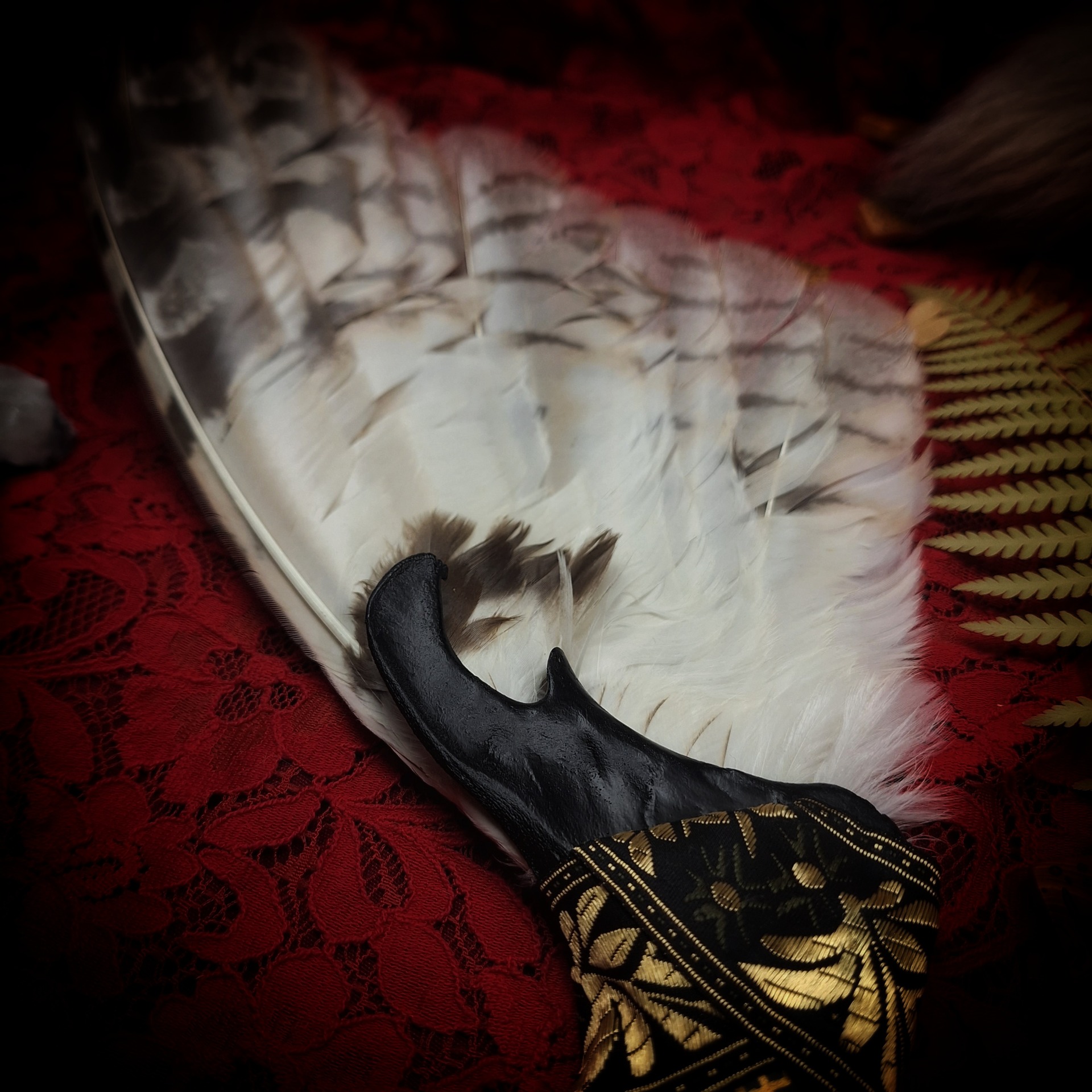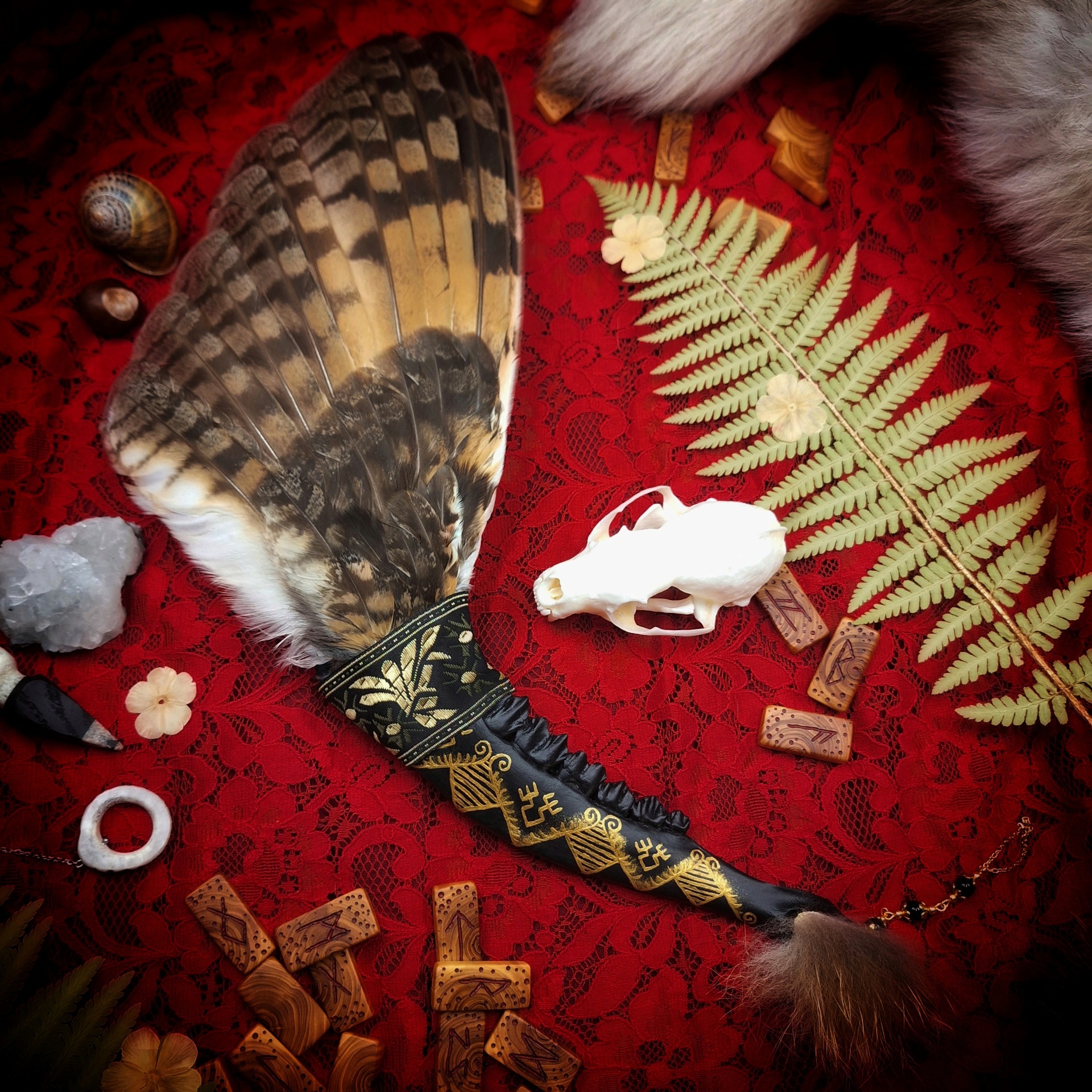 Majestátní vějíř v černo-zlatém provedení pro velké rituály. Do zdobené srnčí čelisti je vloženo celé křídlo kalouse ušatého, které na druhém konci doplňuje kousek liščí kožešiny a závěsné řetízkové očko s obsidiány.