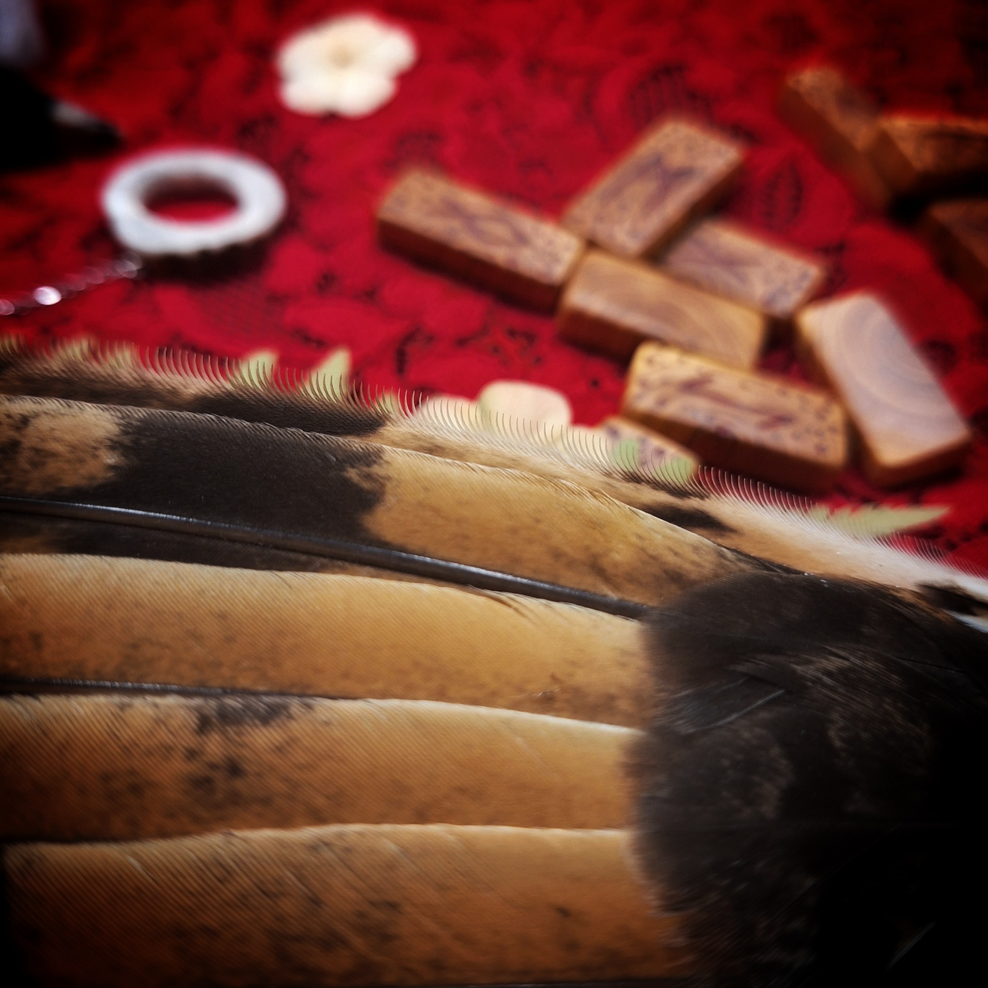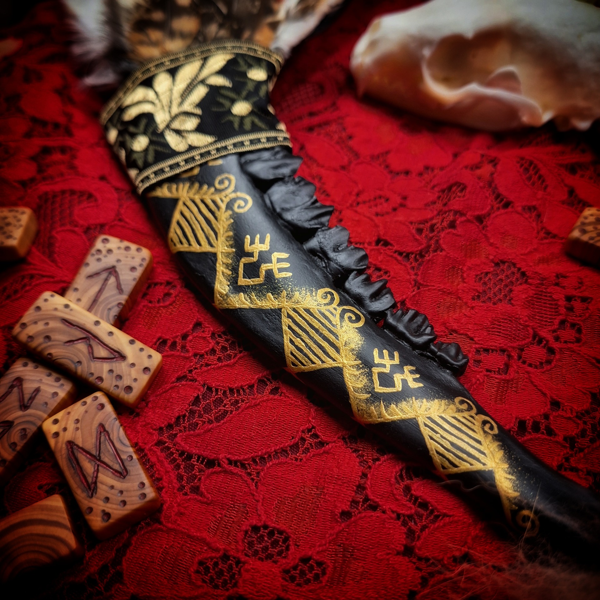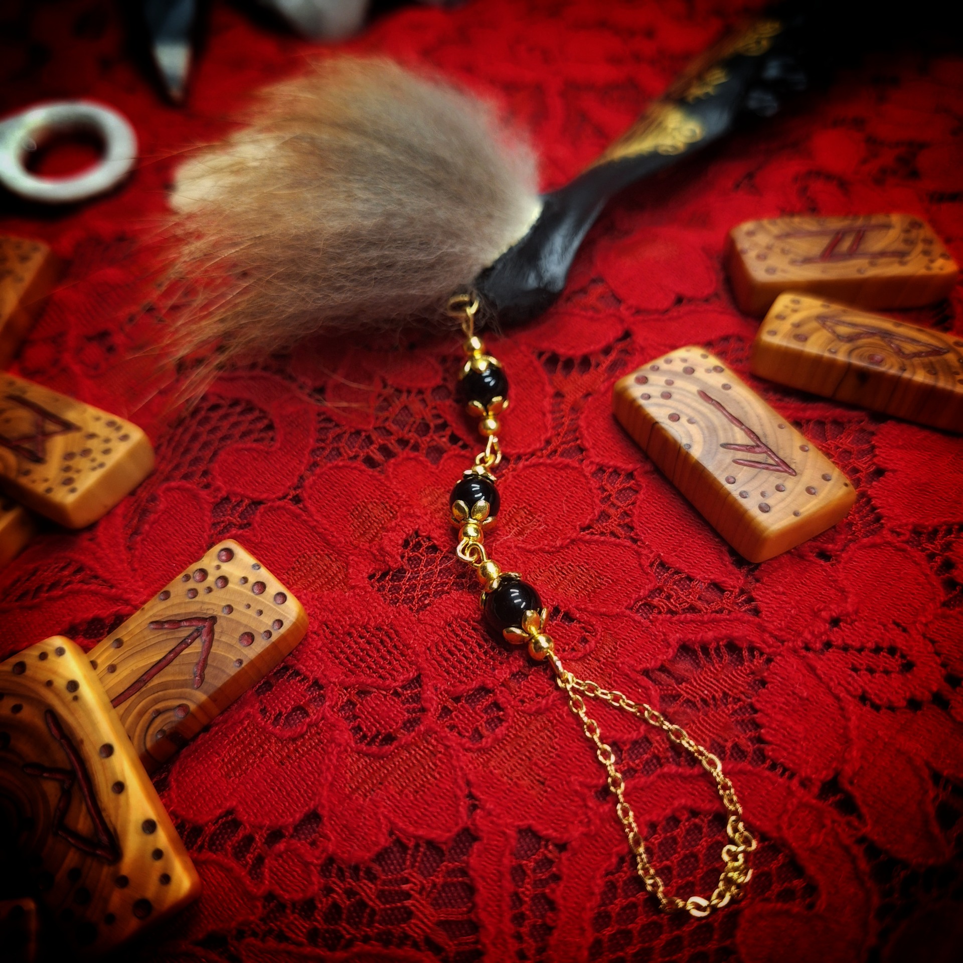 Majestátní vějíř v černo-zlatém provedení pro velké rituály. Do zdobené srnčí čelisti je vloženo celé křídlo kalouse ušatého, které na druhém konci doplňuje kousek liščí kožešiny a závěsné řetízkové očko s obsidiány.