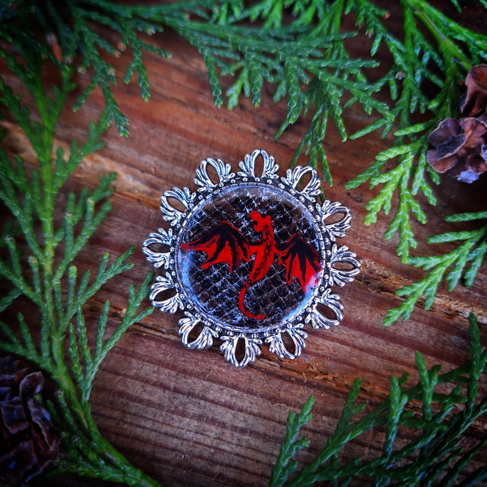 Brož s pravou hadí kůží s vrstvenou malbou. Rudý drak je podložen kůží z černé varianty hroznýše královského se šupinami zvýrazněnými stříbrnou barvou.