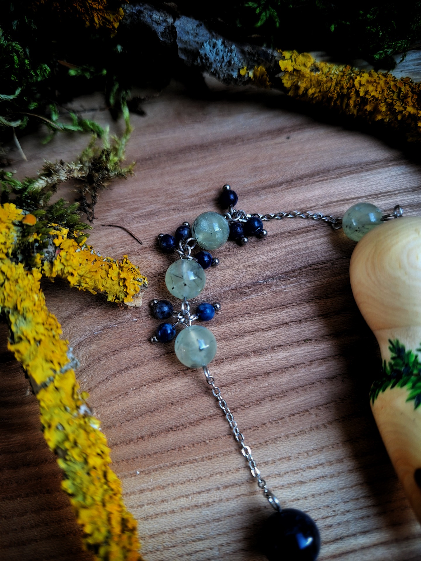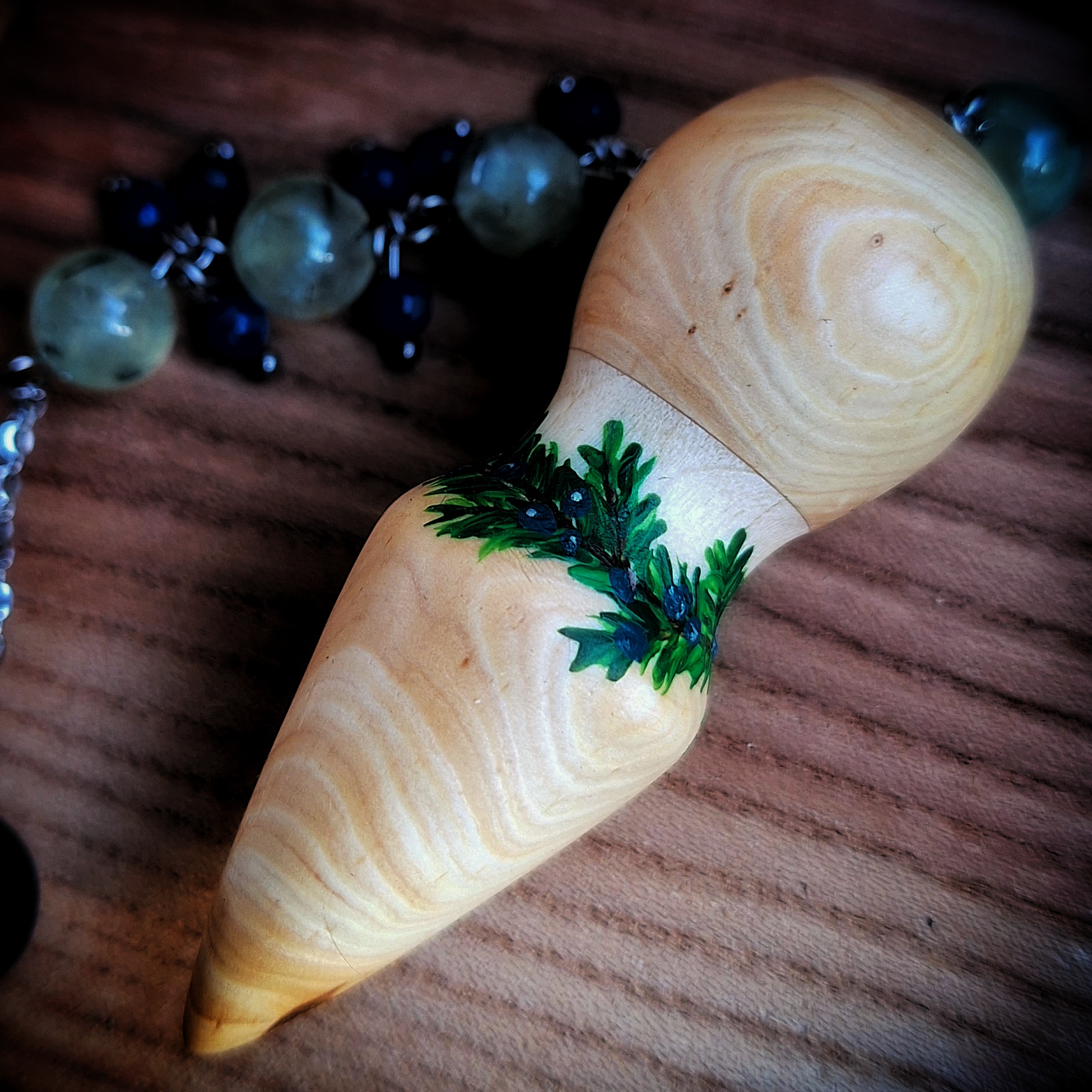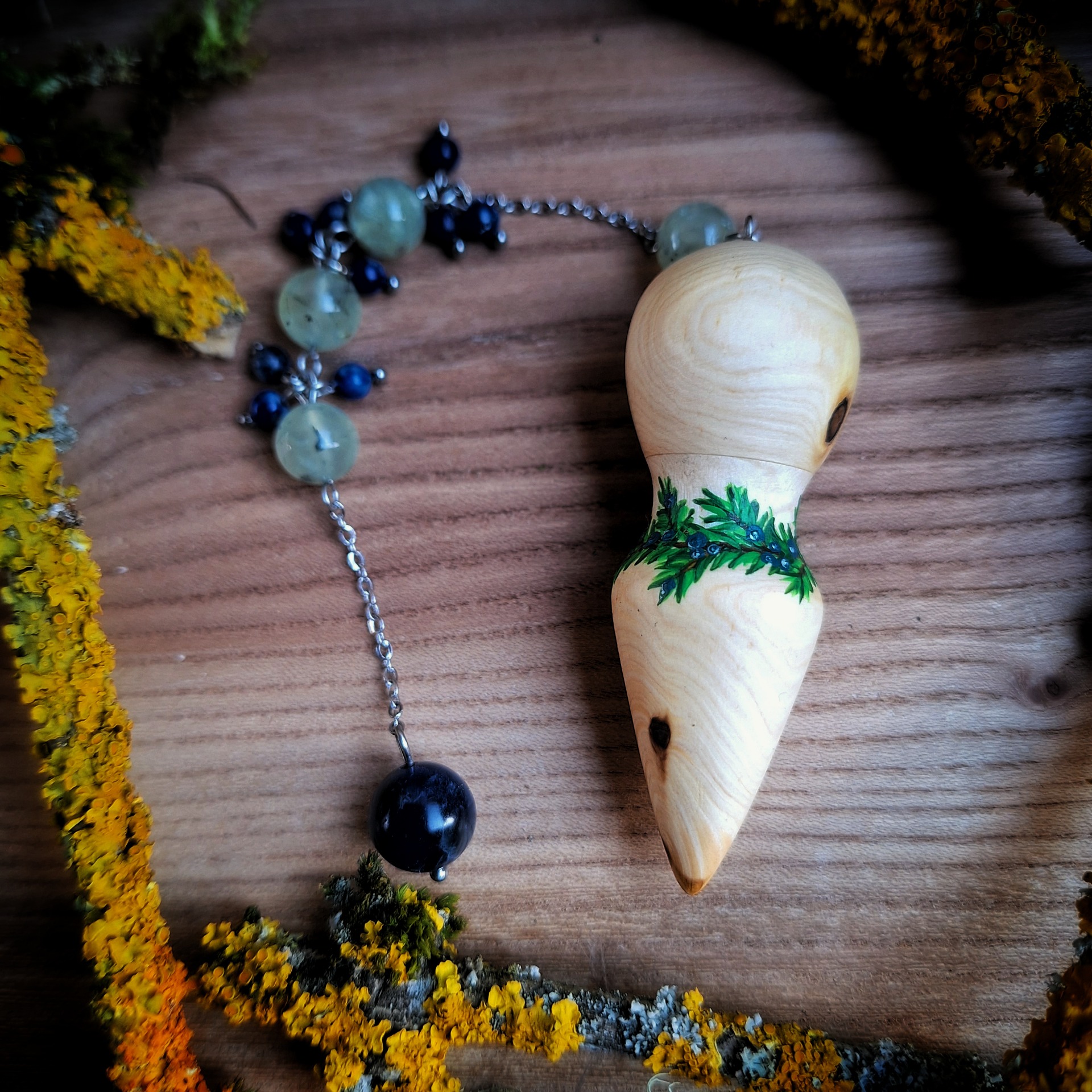 Ručně broušené kyvadlo ze dřeva jalovce a břízy s malovaným jehličím a jalovčinkami, doplněné korálky prehnitu alapisu lazuli.