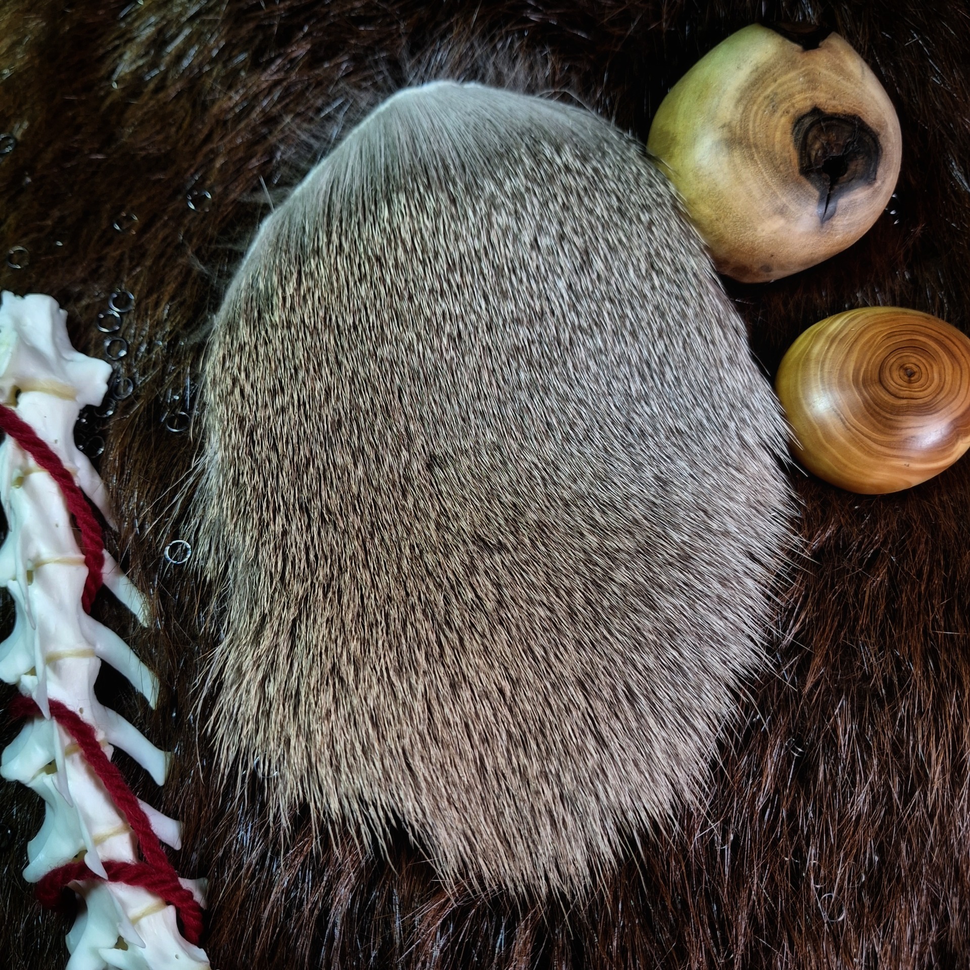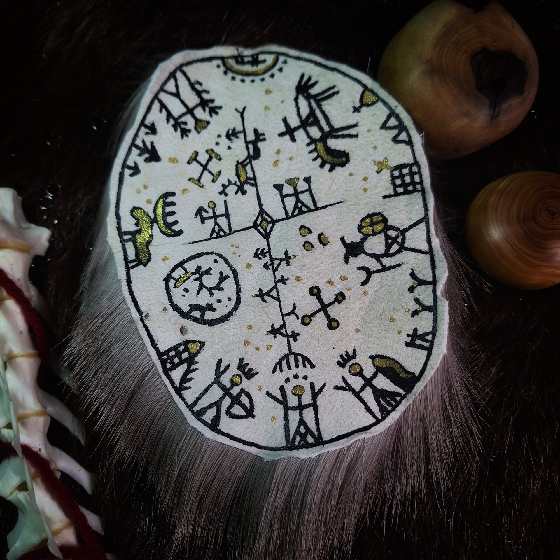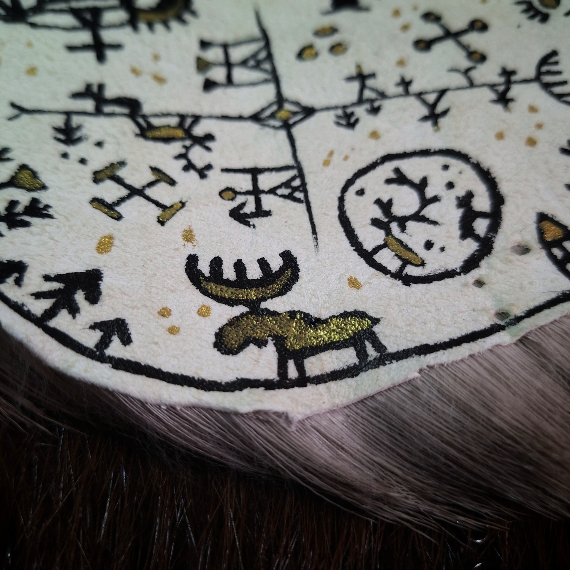 Kus jelení kožešiny s ručně malovaným zobrazením světa podle sámských noidských bubínků v černé a zlaté barvě. Jedná se o heliocentrické zobrazení světa a podsvětí, božstev, čarodějnic, šamanů a výjevů z běžného života.