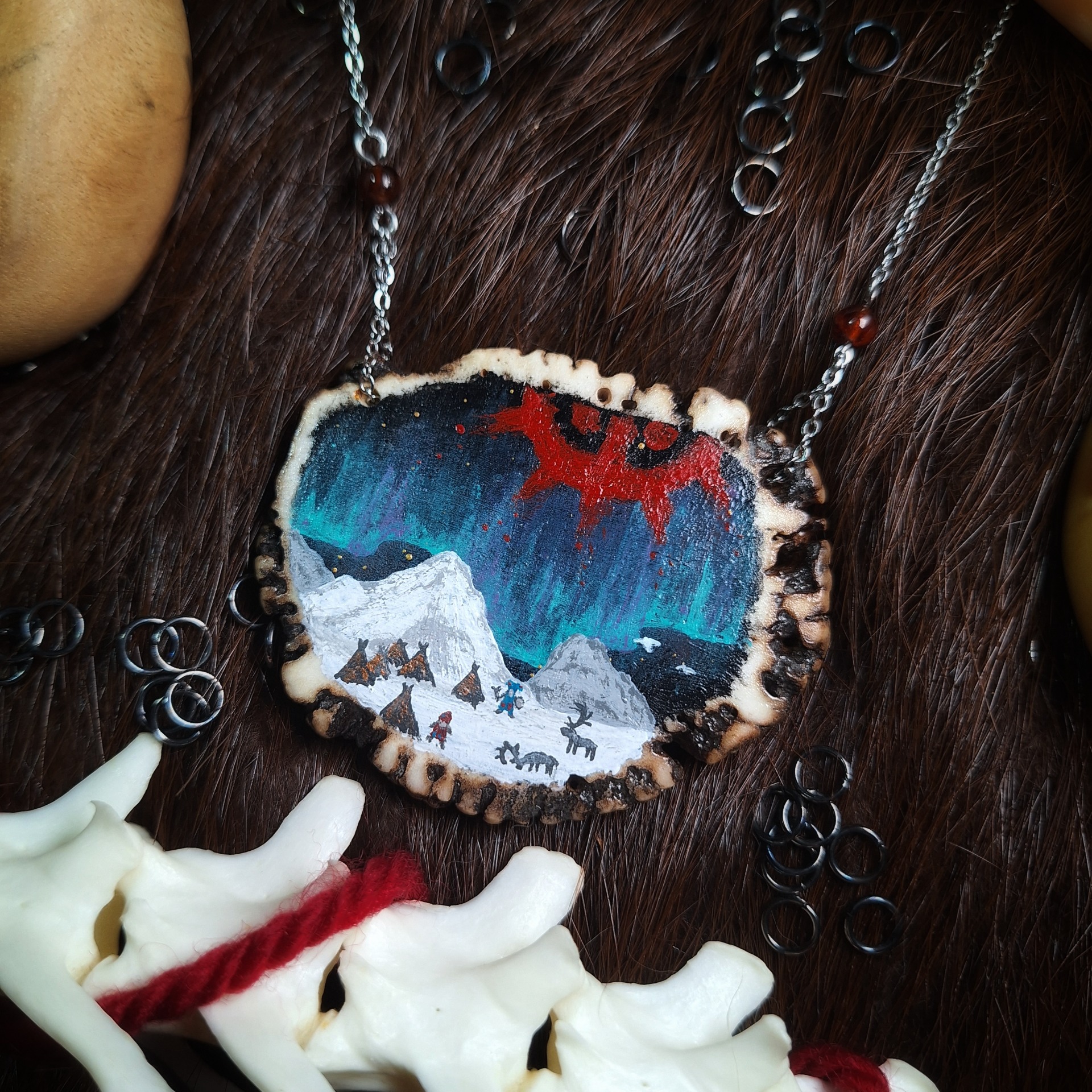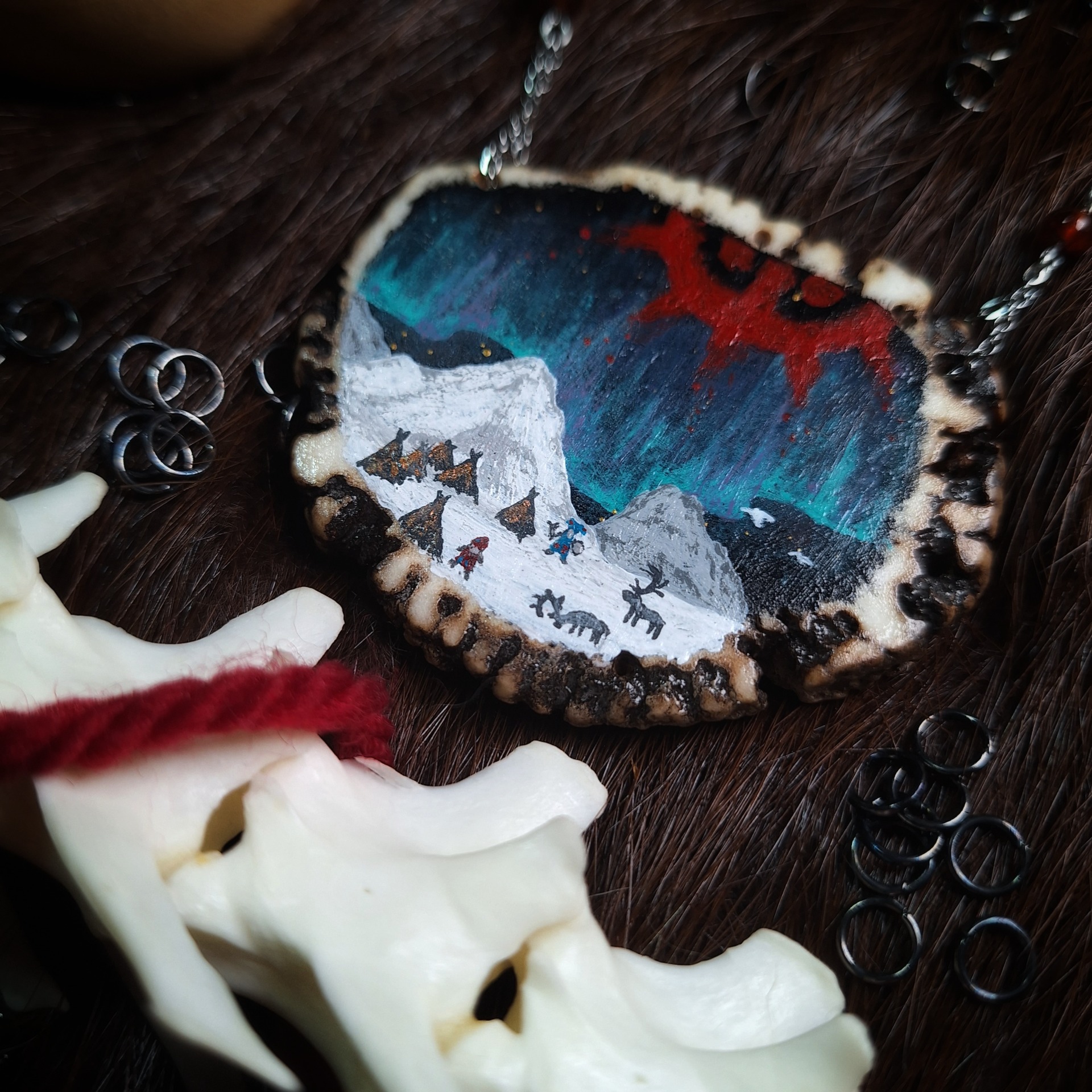 Ruční malba sámského tábora na růži z jeleního parohu. Limitovaný kus, unikát.